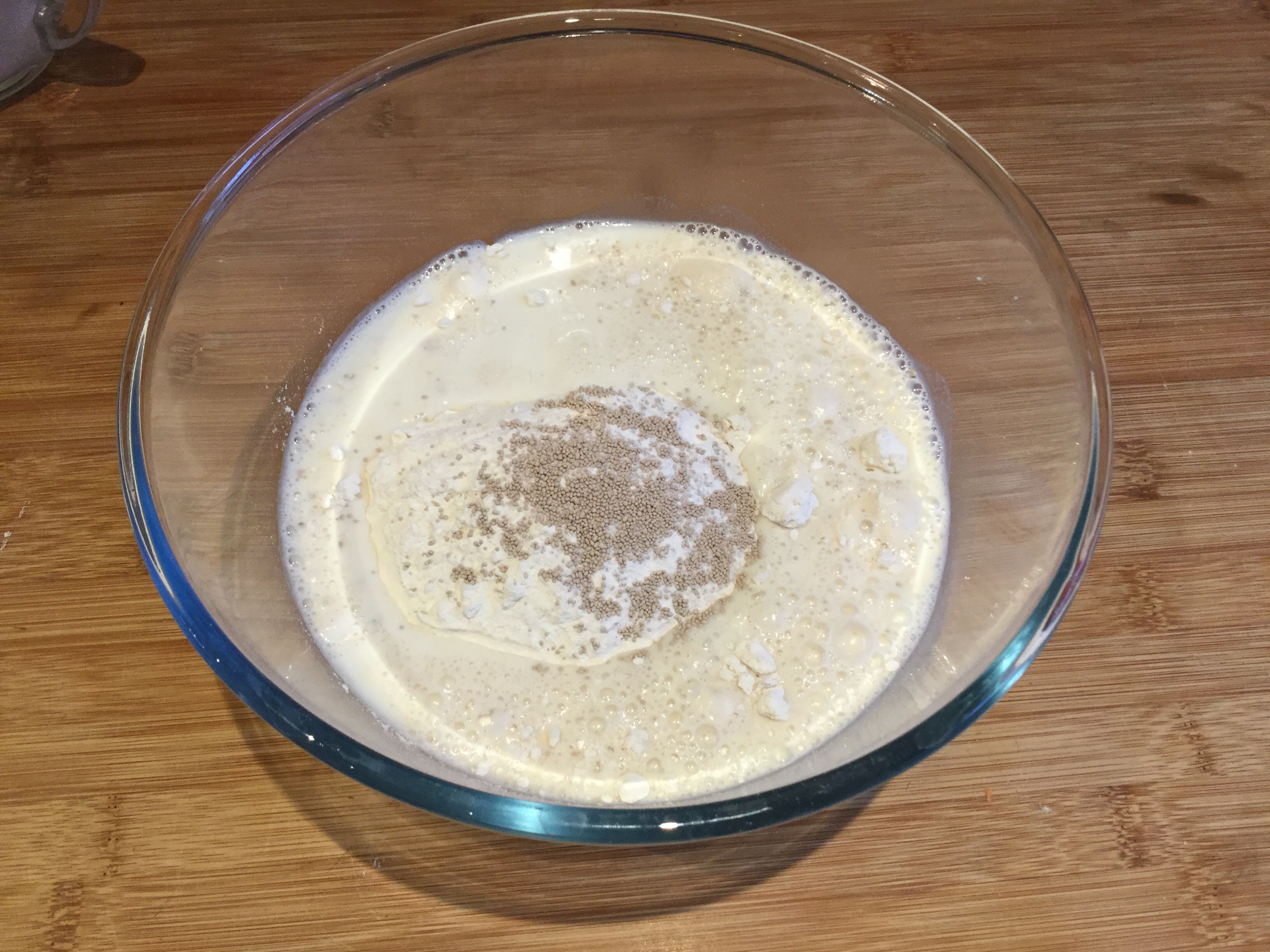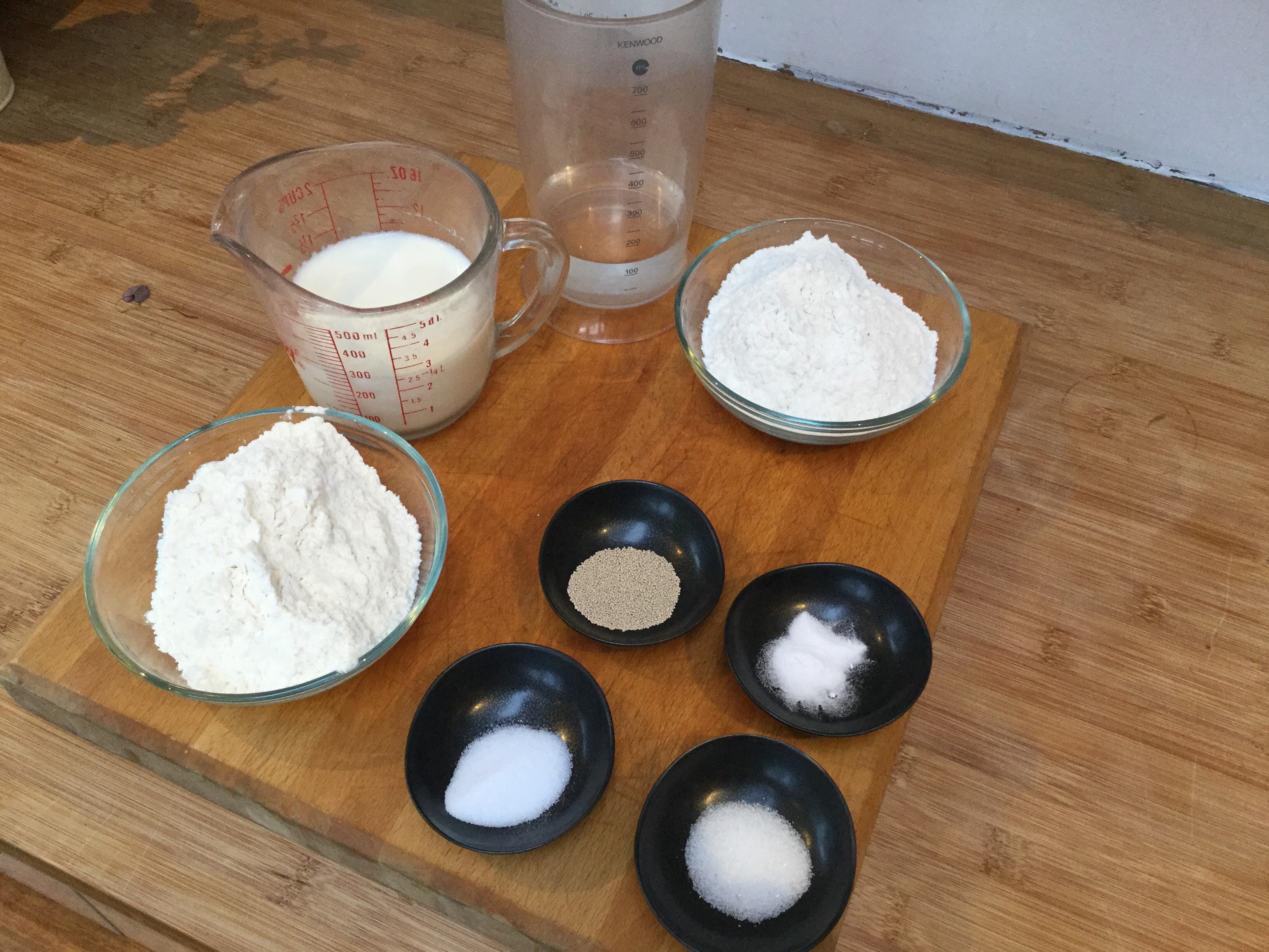 - 強力粉、薄力粉、イーストをボールに入れ、混ぜ合わせます。牛乳を鍋で35-40°Cに温め、砂糖を入れ、溶けます。牛乳を強力粉とかのボールに入れ、木べらでよく混ぜます。「3-4分」