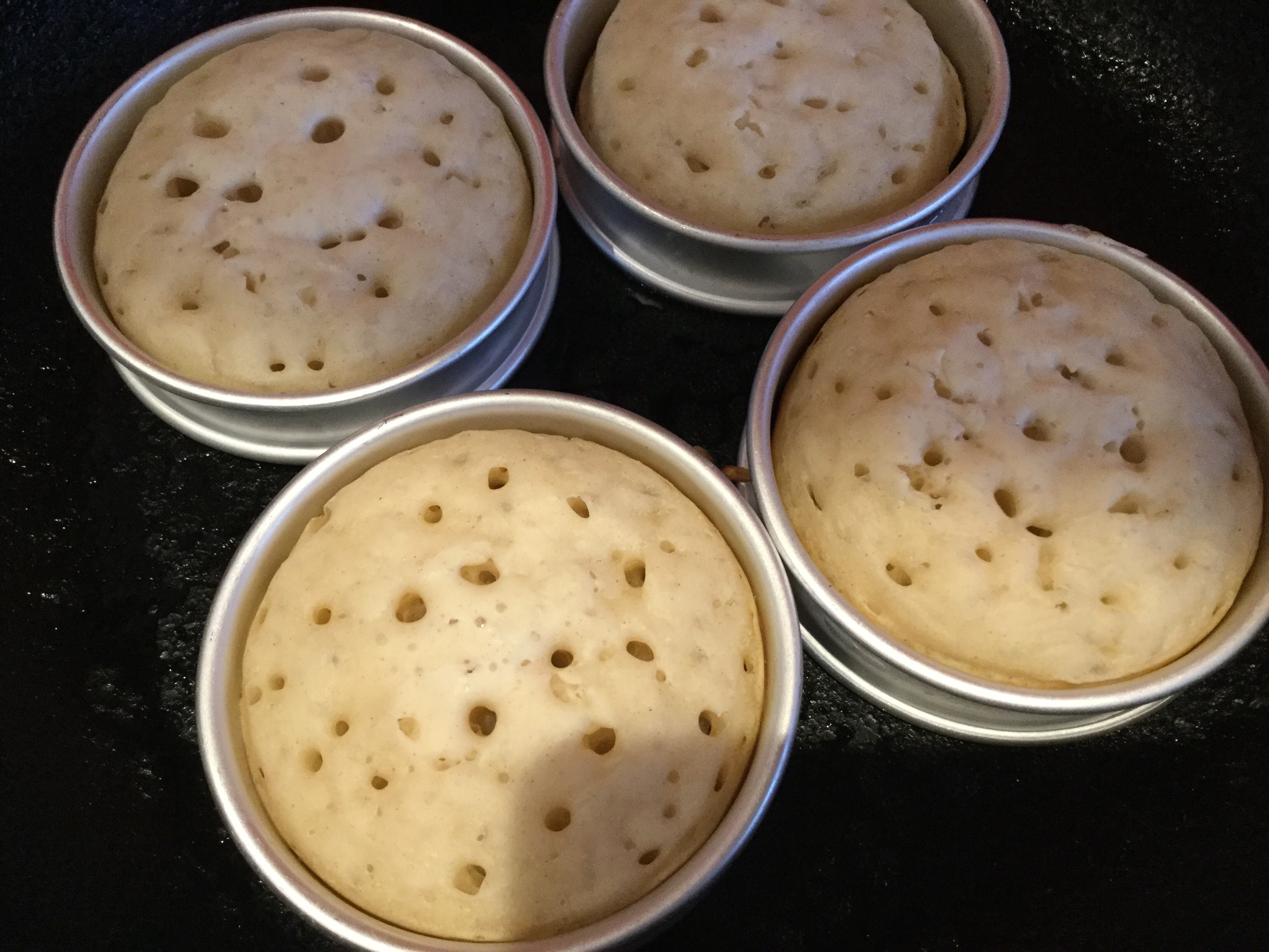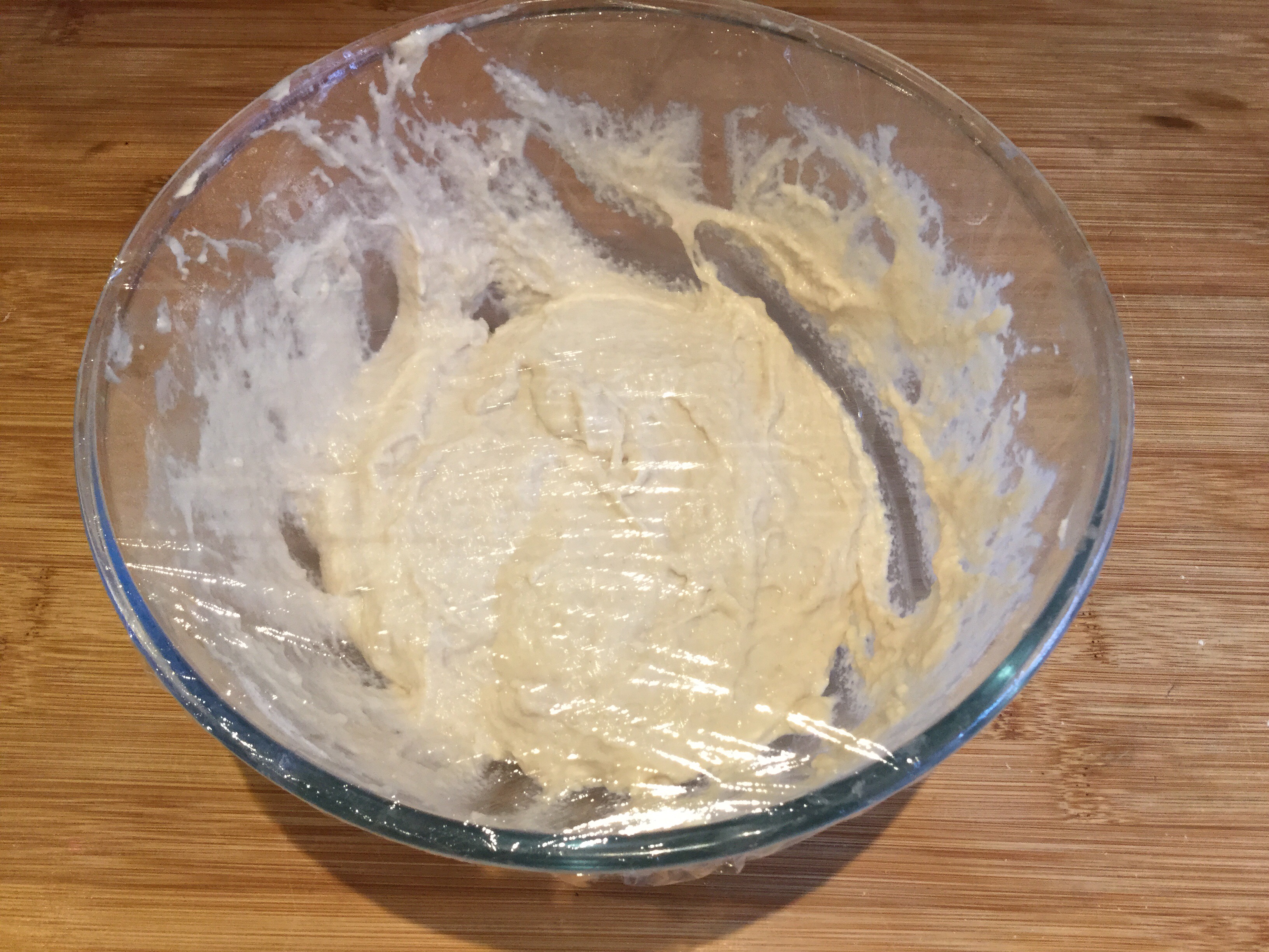 - ボールにラップをして暖かい場所に置き、1時間ごろ発酵させます。生地がイーストの働きで最初に膨らんでから、少し減ります。