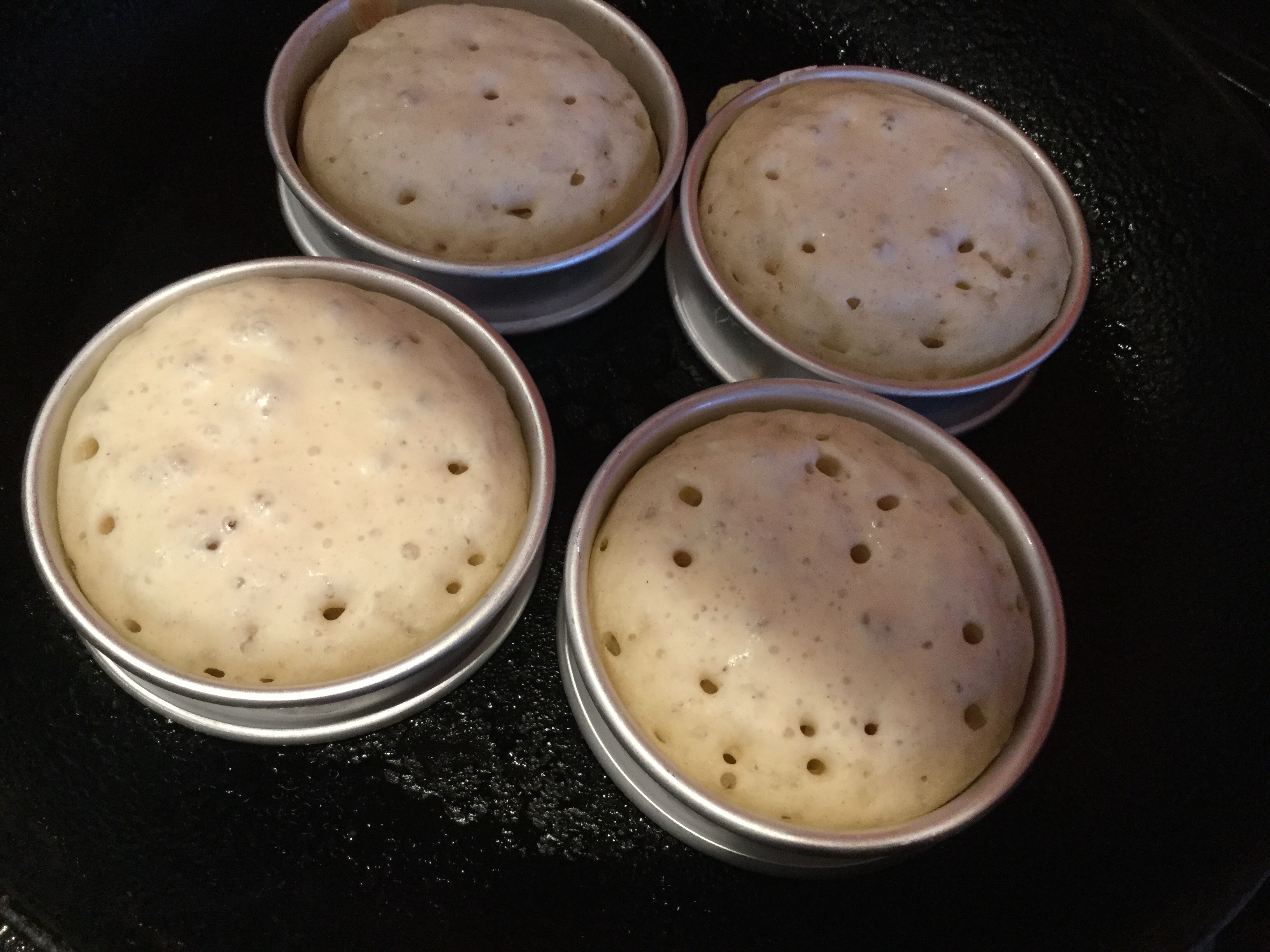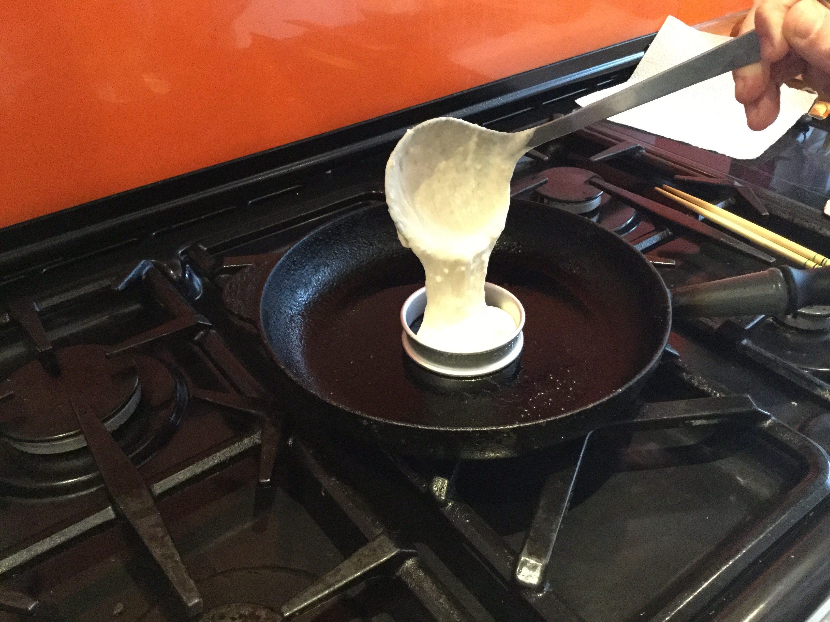 - 生地を厚さ1cmまでセルクルに流し込み、弱火で焼きます。穴がブツブツあいてきます。