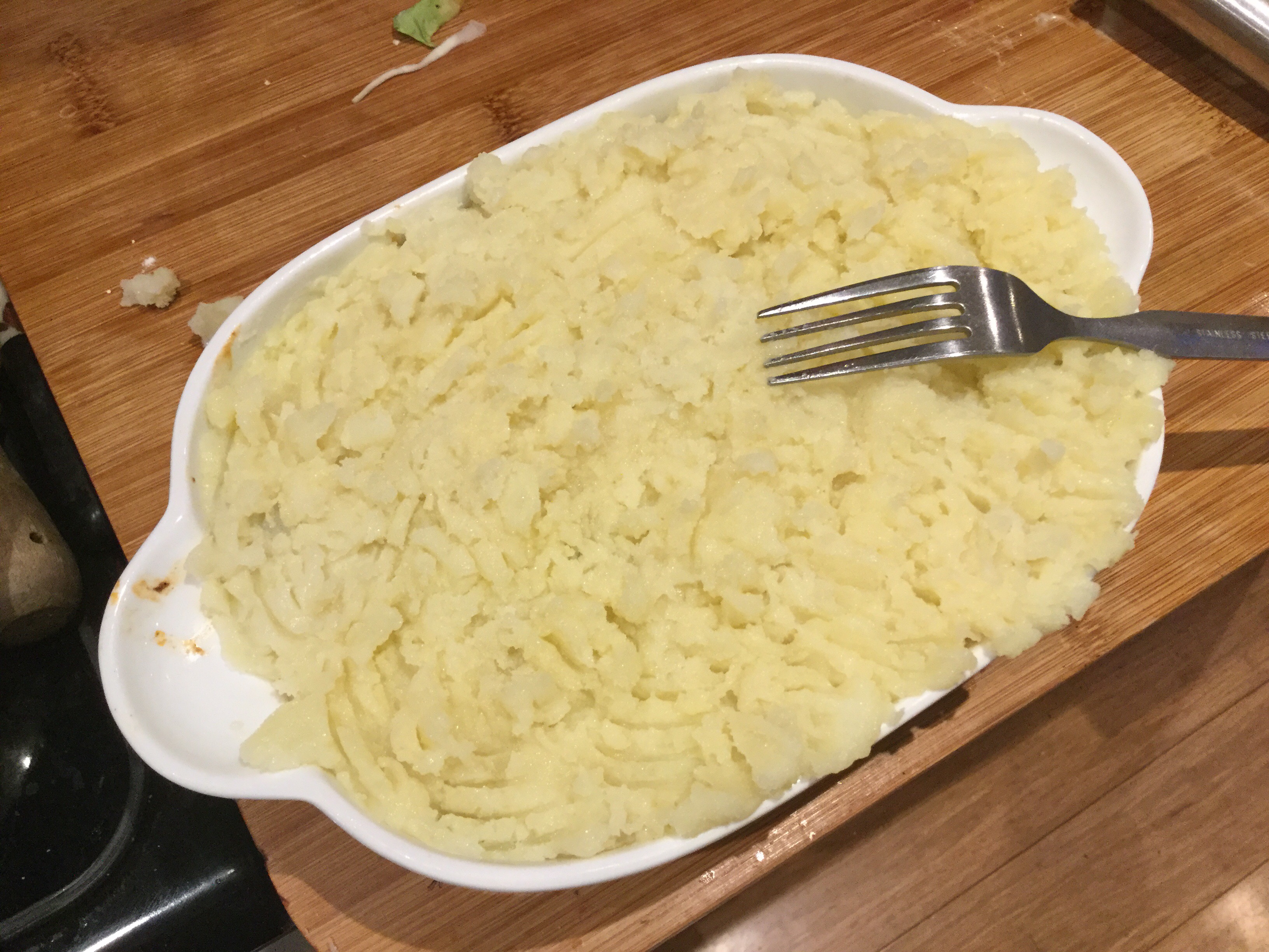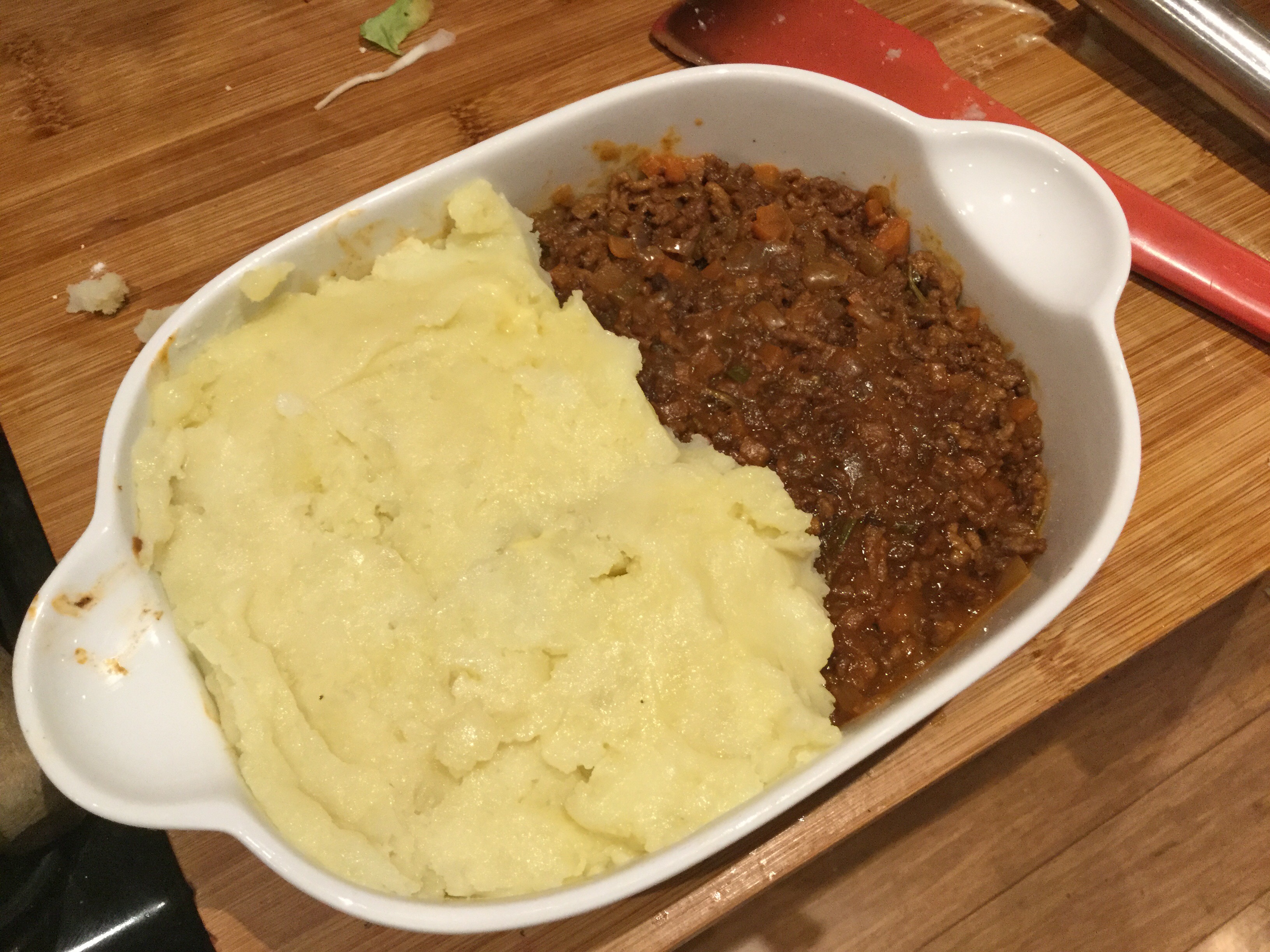 - ラム肉とかを耐熱容器に入れて、上にマッシュポテトを重ねて広がります。