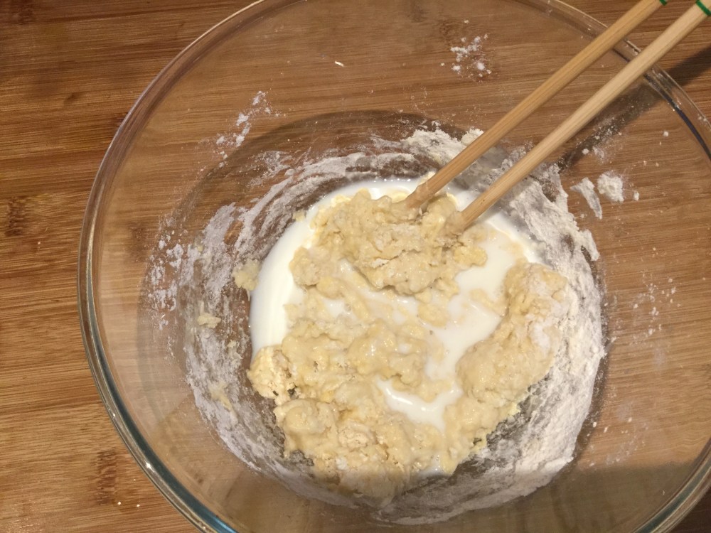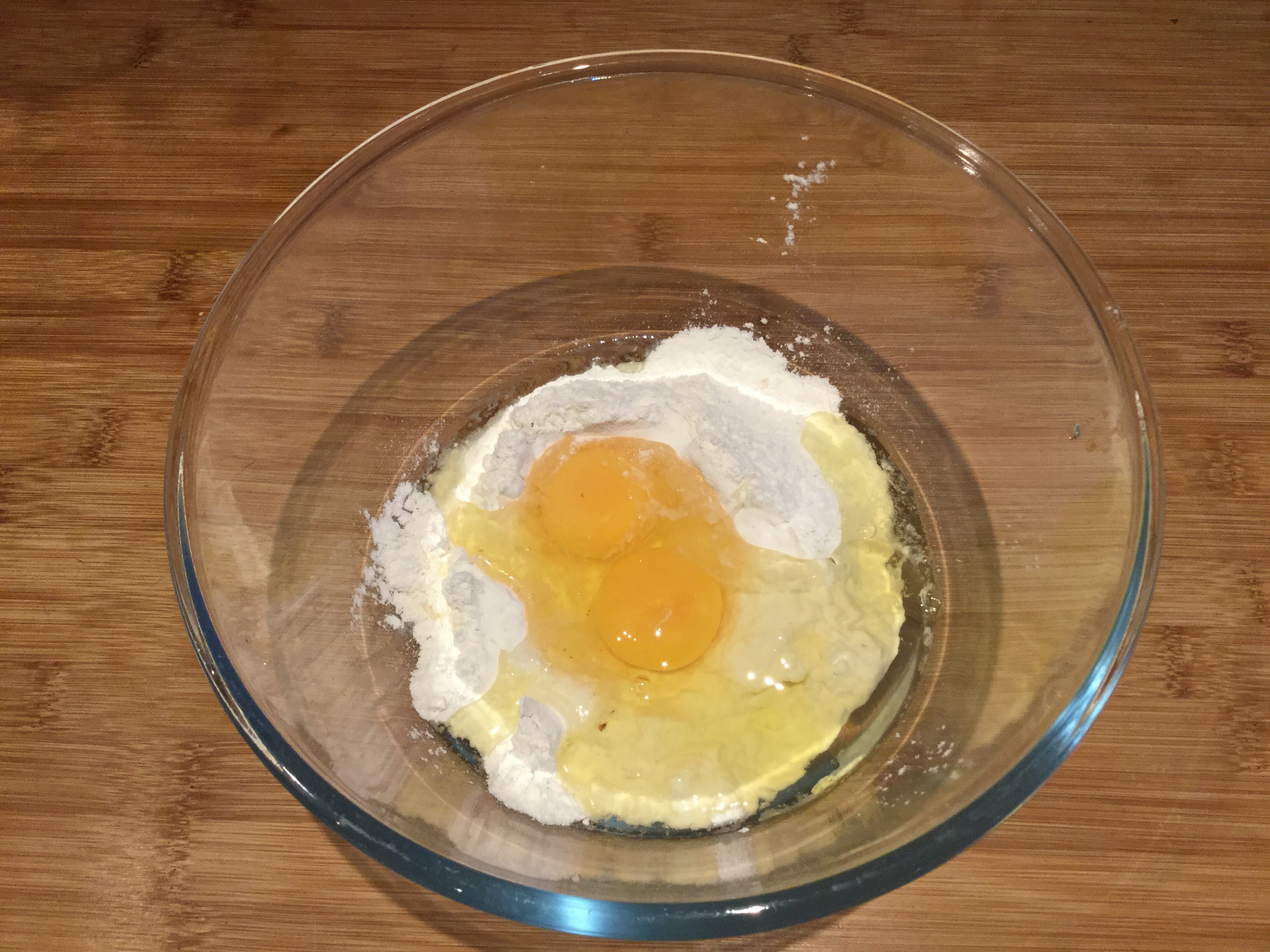 - 小麦粉をボールに入れ、溶き卵を加えて混ぜる。