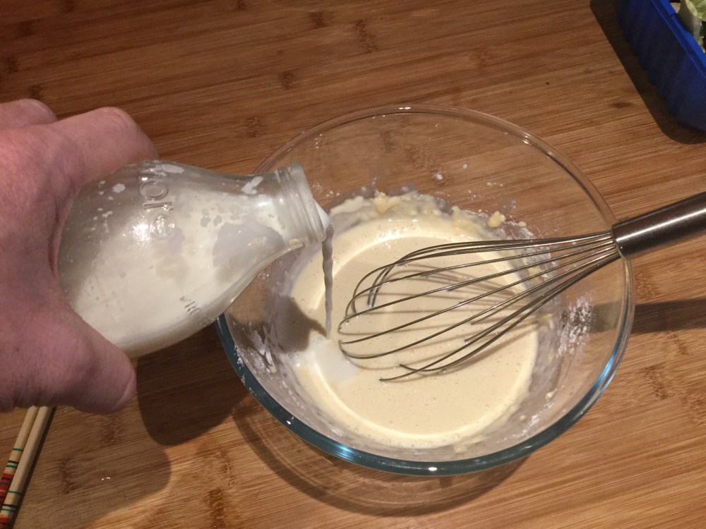 - 泡立て器で混ぜながら牛乳と水を少しづつ加える。「早すぎ加えたら、かたまりを作る。」