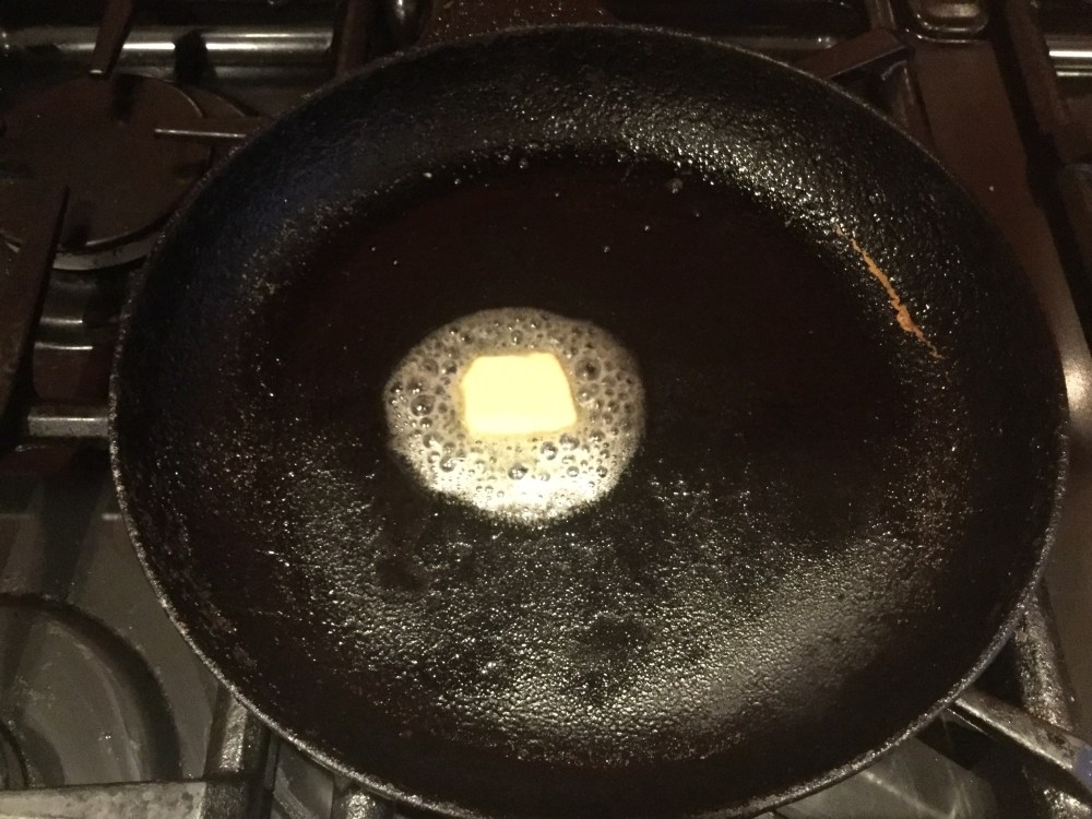 - 各パンケーキのため、新しくフライパンにバターを入れる。「一番目のパンケーキはほとんどよくない。」