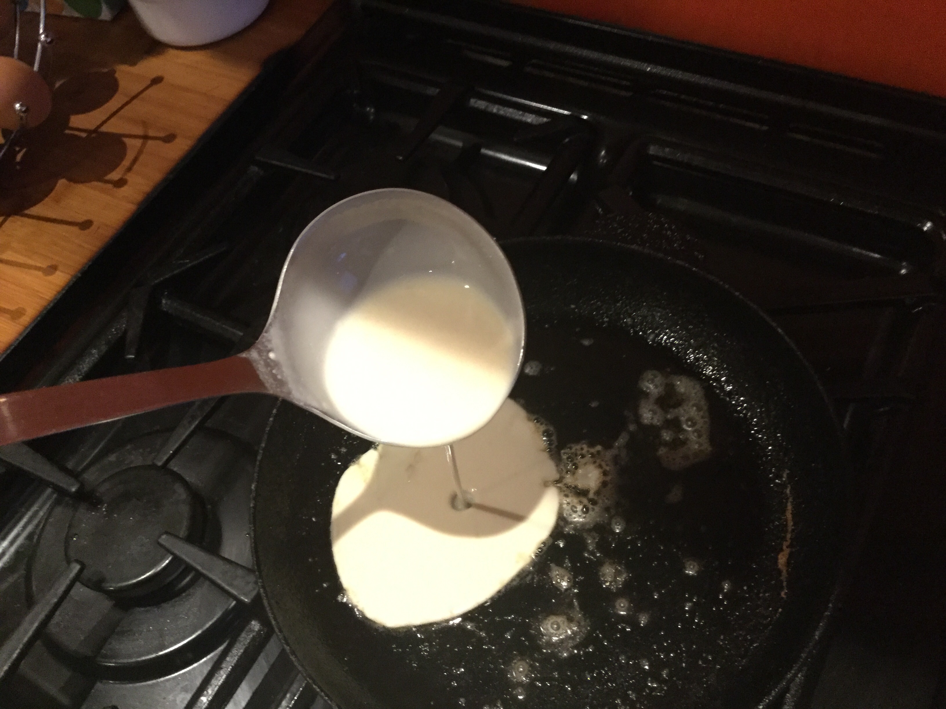 - フライパンにバターの少しを溶かし、生地をお玉一杯くらい流し、フライパンに薄く広げる。「広げにくかったらボールの生地に牛乳をまた加える。」
