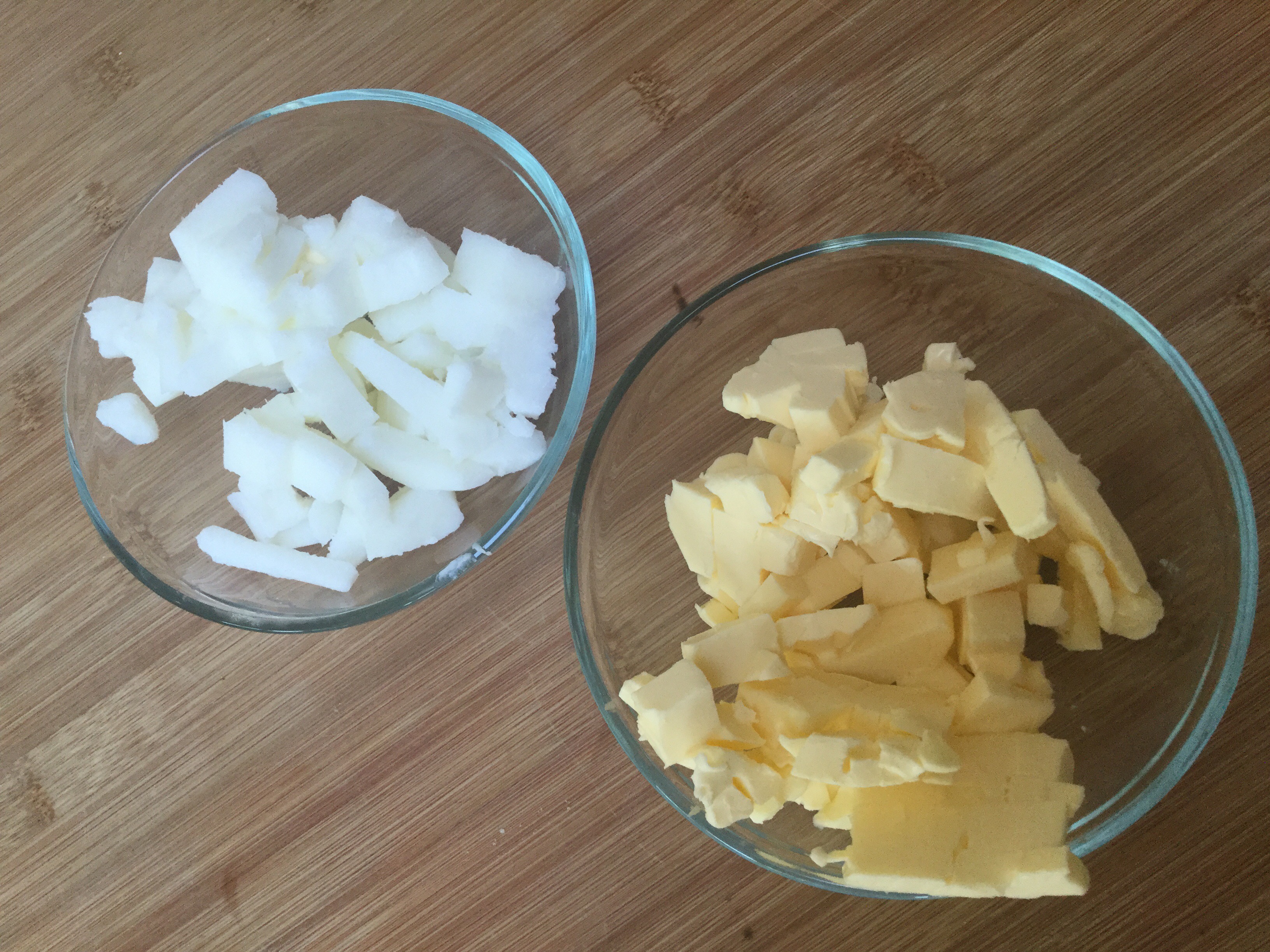 - バターとラードを冷蔵庫で冷たくしてからさいの目に切ります。