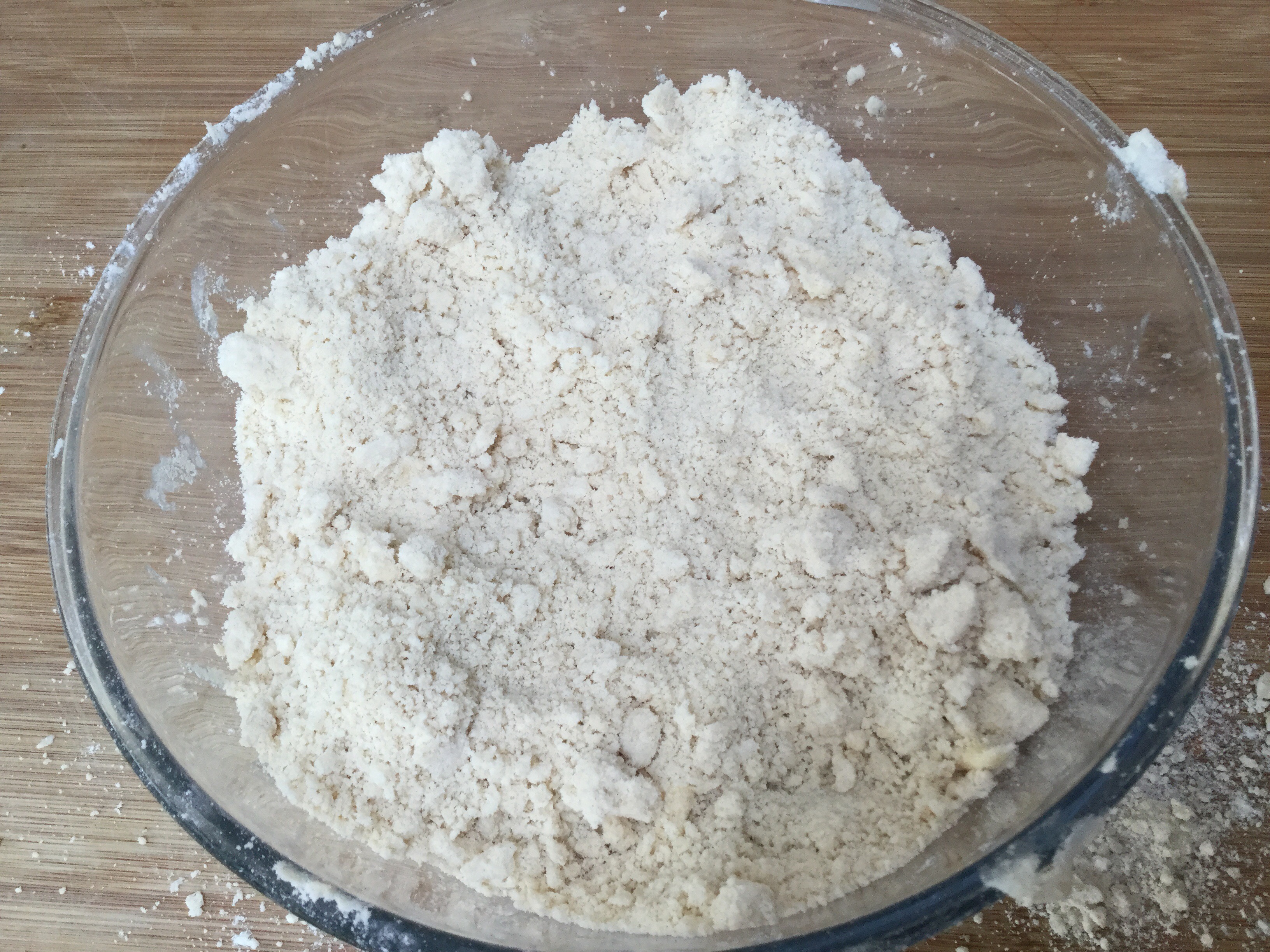 - 強力粉と塩をボールに入れ、バターとラードを加えて、そぼろ状にするまでに指先ですり合わせます。
