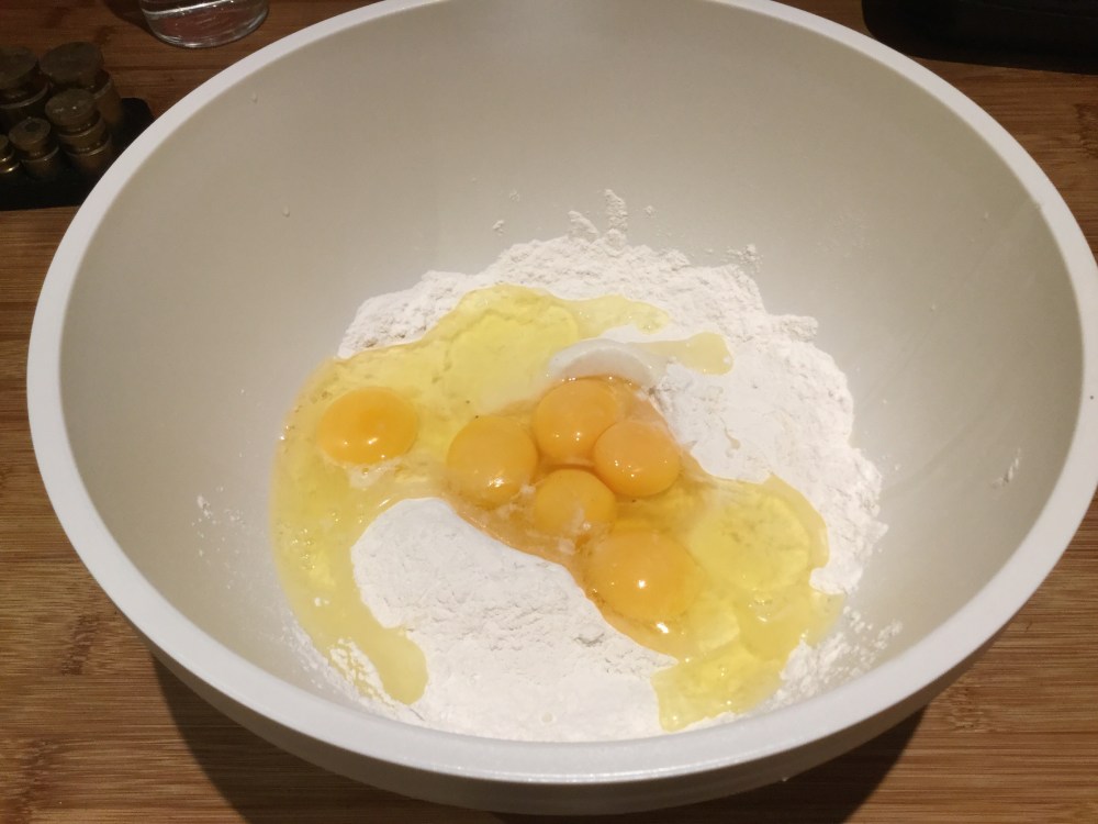 - 小麦粉をボールにふるい入れ、溶き卵と卵の黄身を加えて、スプーンで混ぜます。