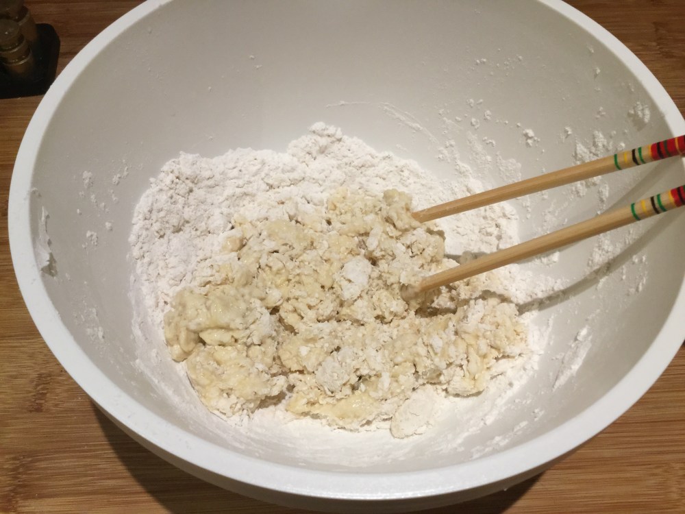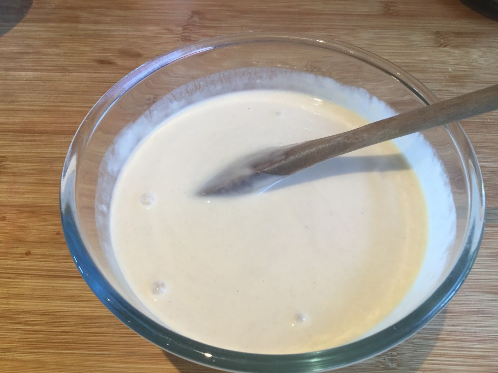 - 生地を混ぜながら、牛乳と水を少しずつ入れます。