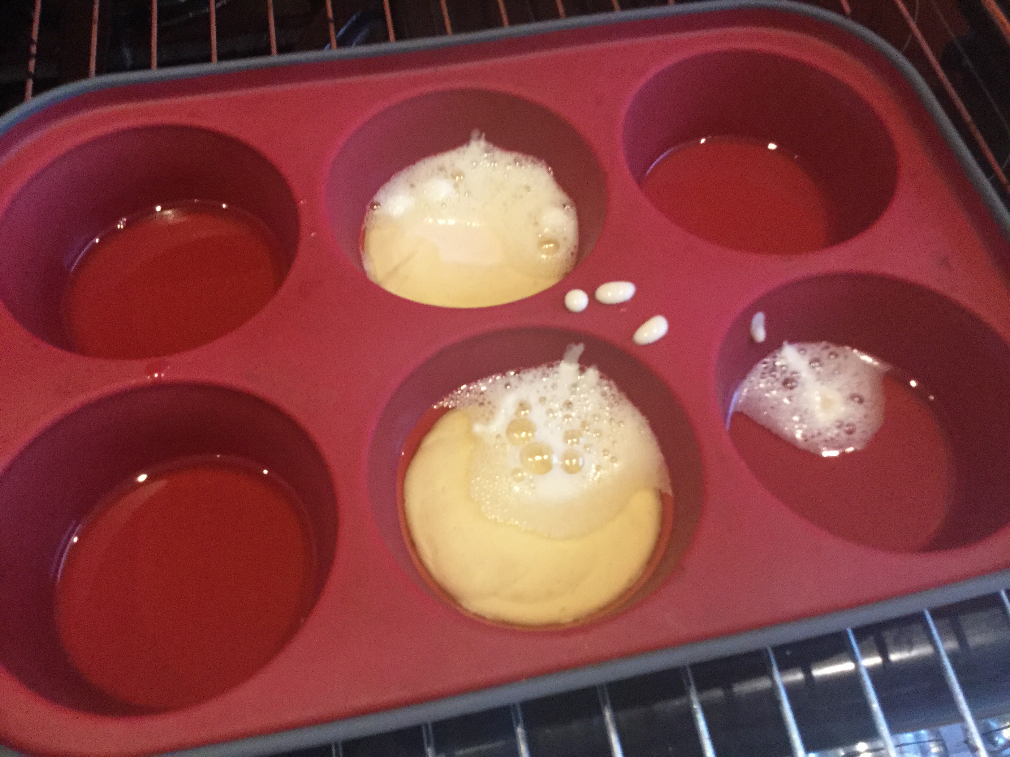 - カップケーキ型をオーブンから取って、ひしゃくの半分くらいの生地を各カップケーキ型に注ぎ、オーブンで25分焼きます。