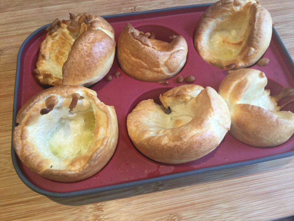 カップケーキ型が小さかったら、ヨークシャープディングがほとんどシュー皮のように球形になります。私はこのブログの写真のようなかなり深いカップケーキ型を使います。