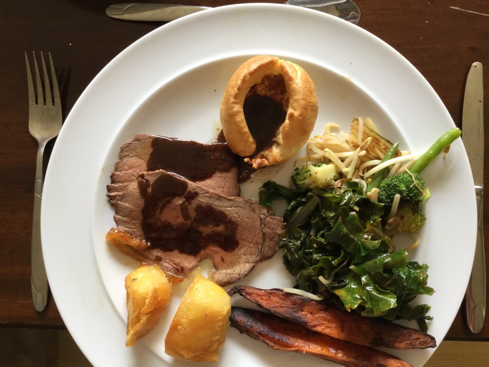 伝統の通り、サンデーランチでローストビーフの付け合わせに食べるのです。ヨークシャープディングの茶わんのような形にグレービーソースとか西洋ワサビのソースを入れます。(グレービーソースのレシピ)