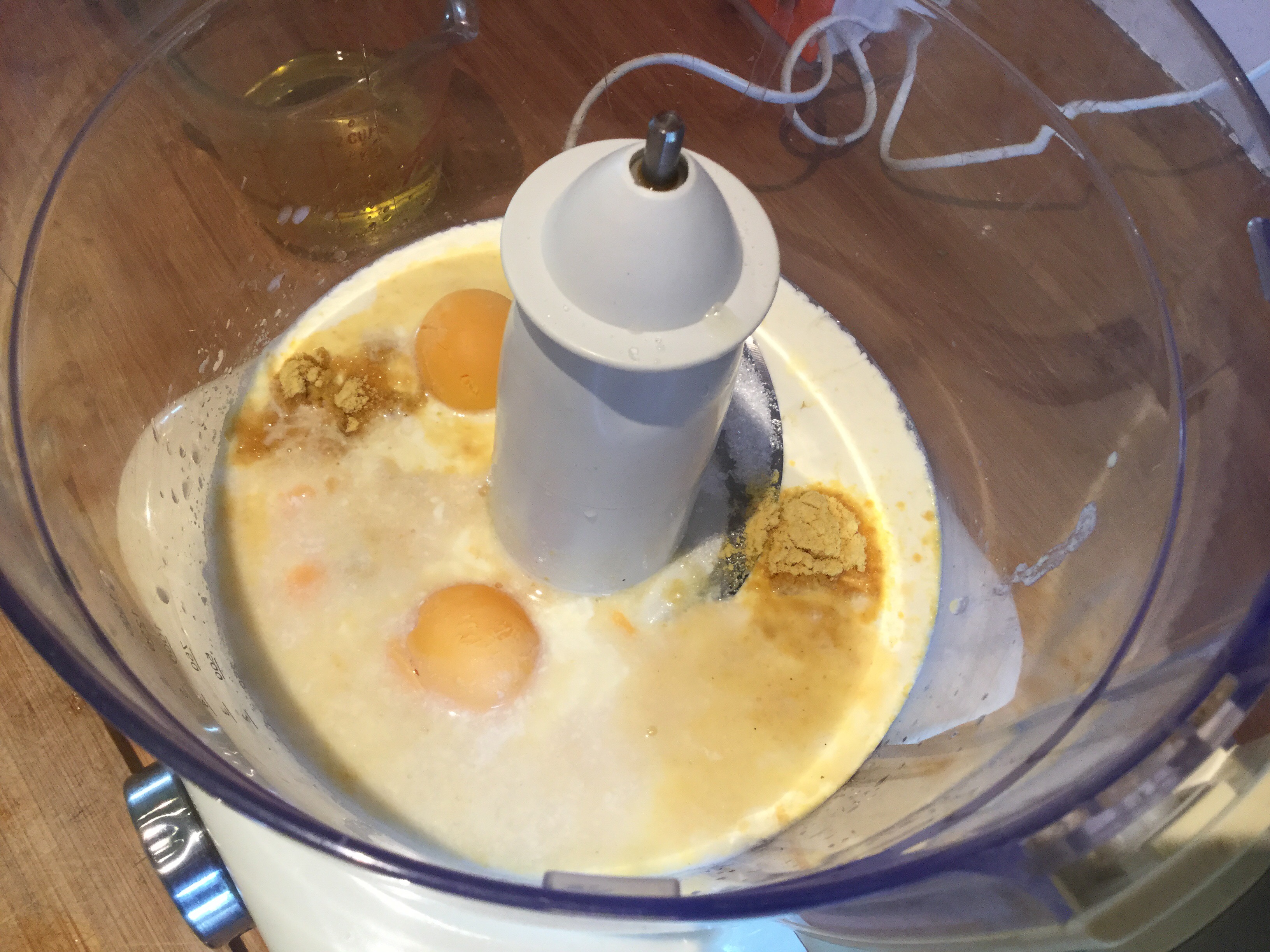 - 油と塩意外、材料をフードプロセッサーに入れ、なめらかに成ったまで撹拌する。