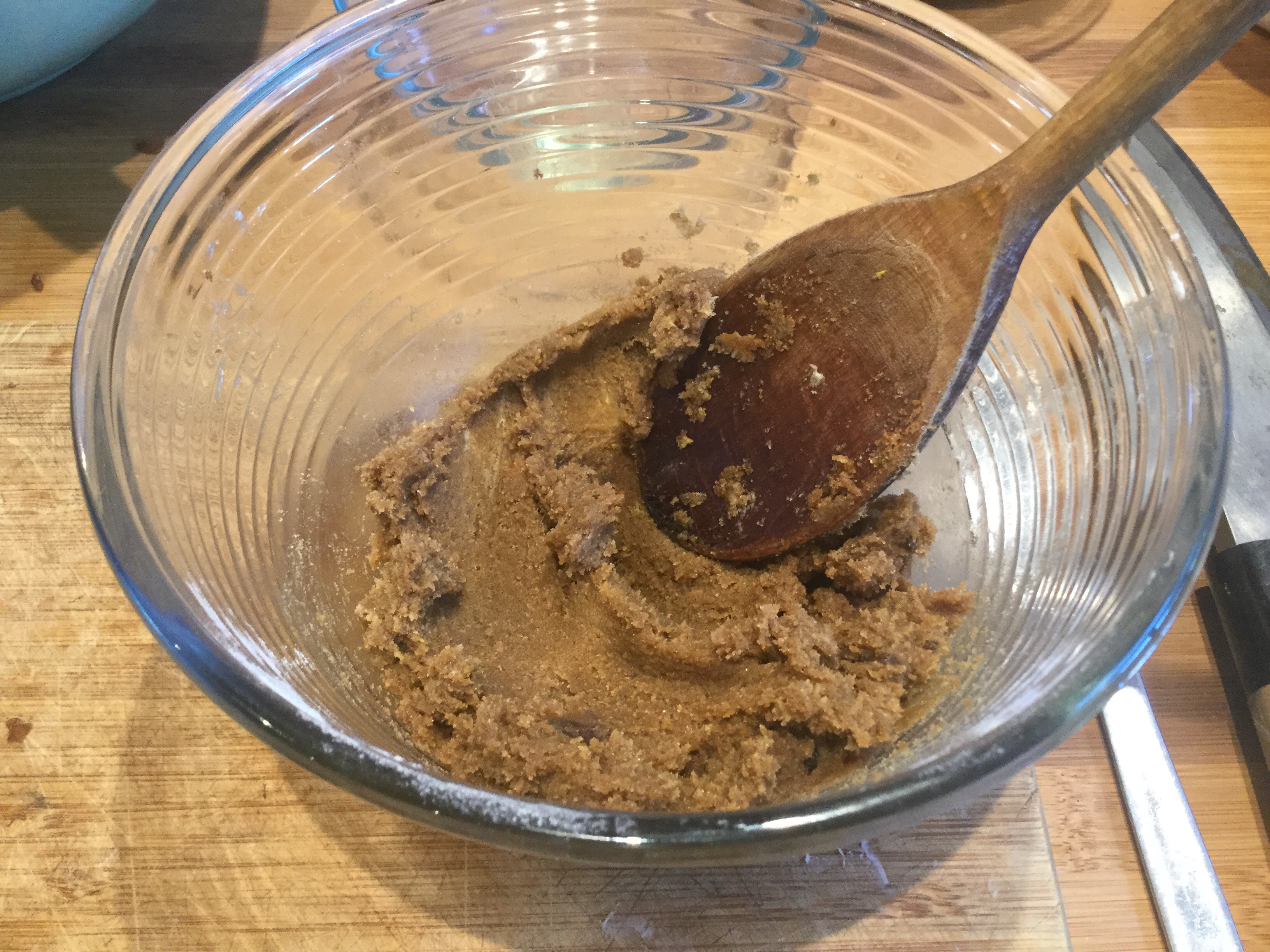 - バターと砂糖をボールに入れ、木ベラか泡立て器でよく混ぜる。