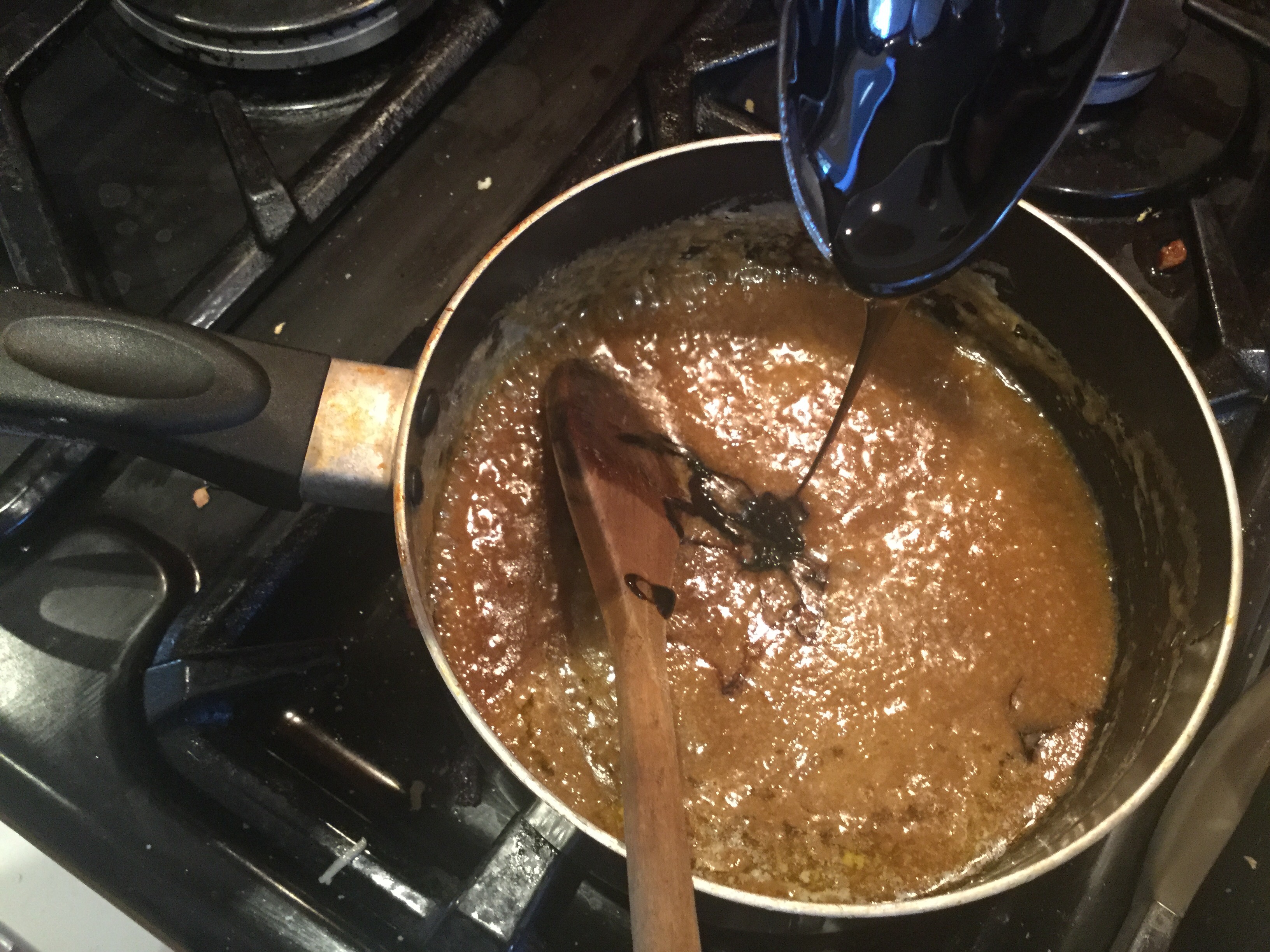 - 焼きながら、ソースを作る。鍋に砂糖、バター、ブラックトリークル、生クリームをいれ、砂糖が溶けふつふつするまで混ぜながら火にかける。
