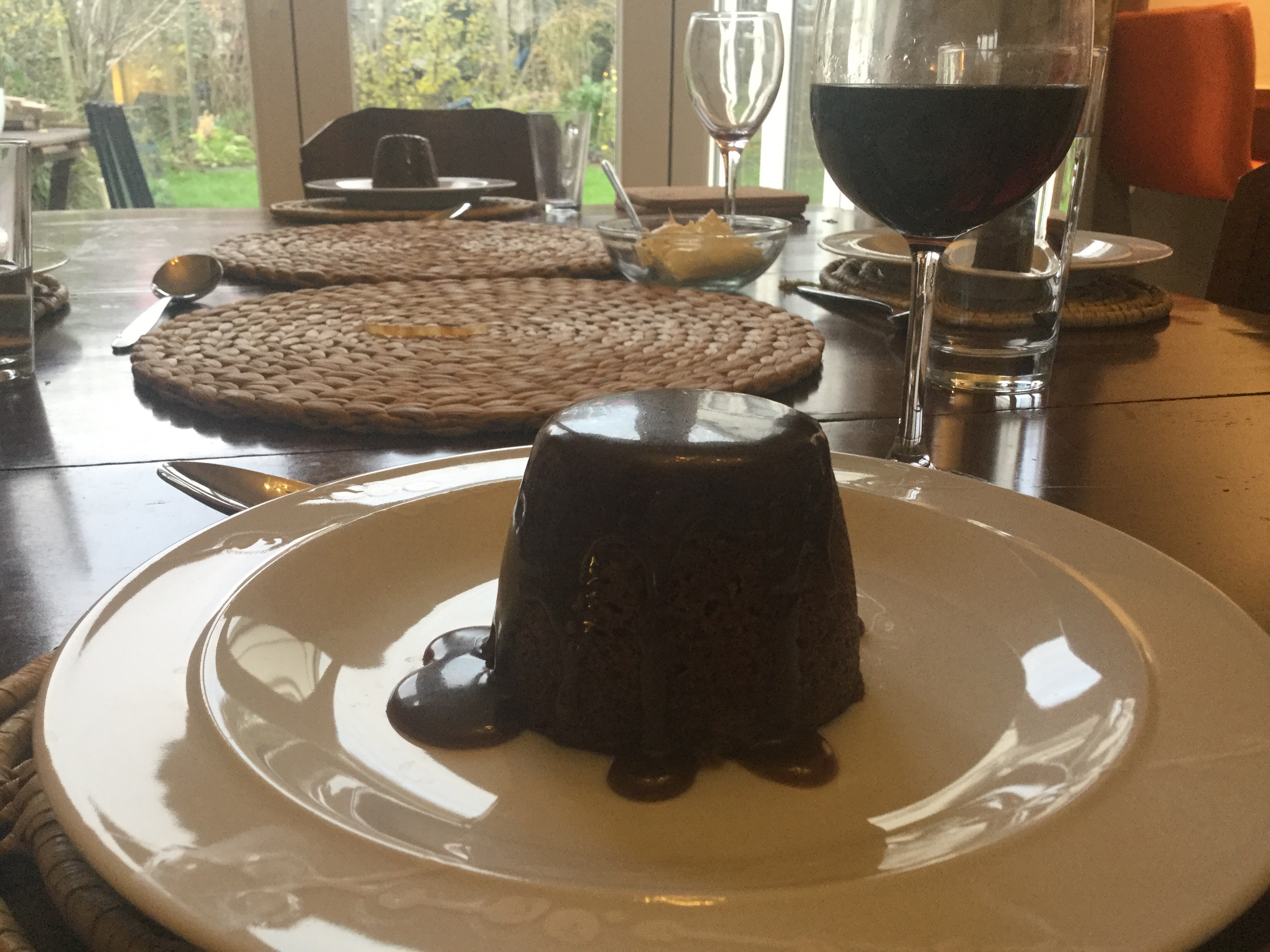 - 焼いたプディングは皿の上裏返して、上にソースをかける。