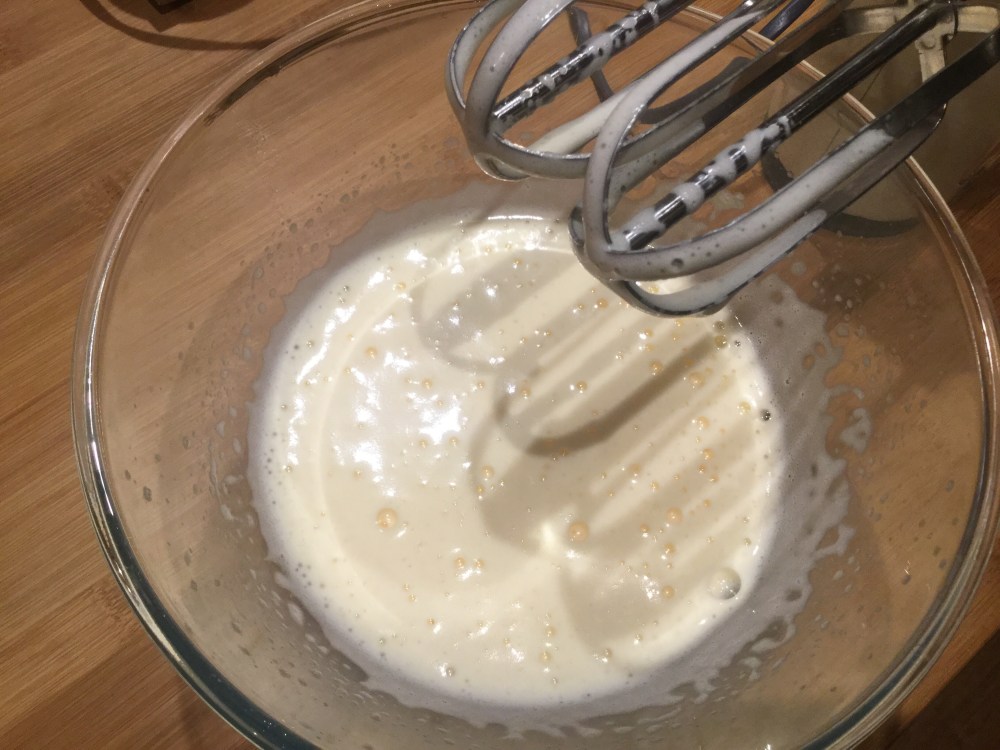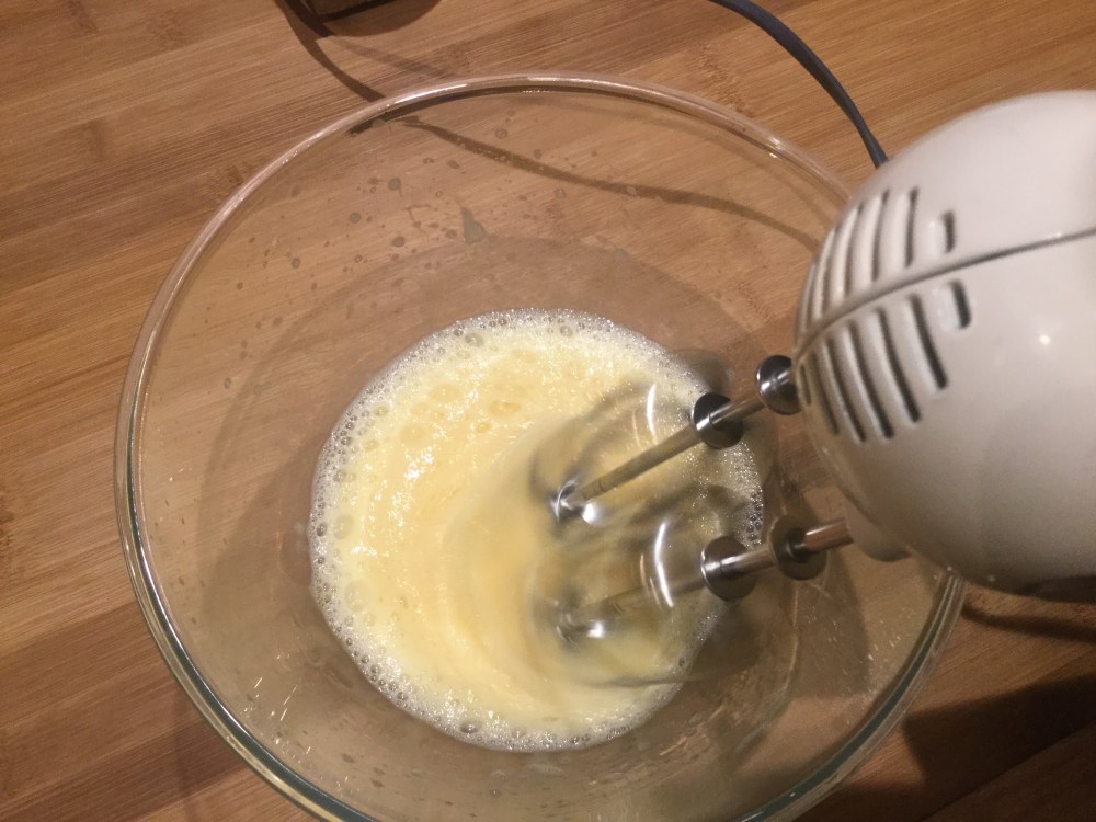 - 卵をボールに入れ、とろみが出るまでよくかき混ぜる。(フワフワしたバッターのため泡立て器かハンドミキサーを使う。)