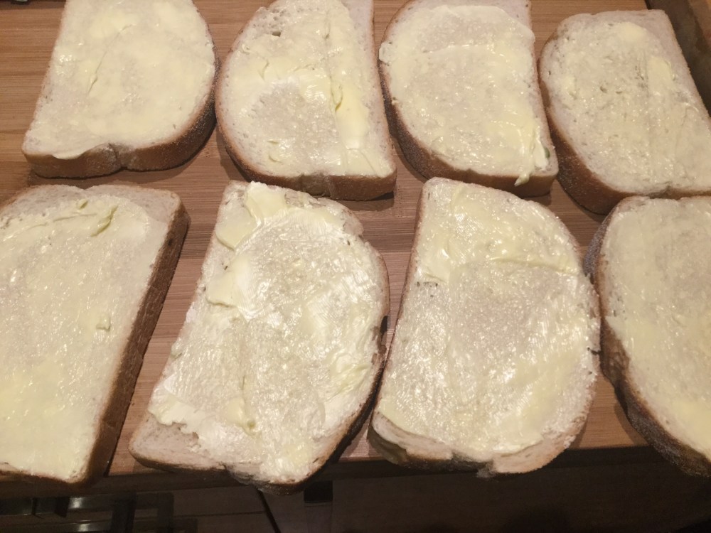 - 耐熱皿にバターを塗り、パンの半分を並べる。