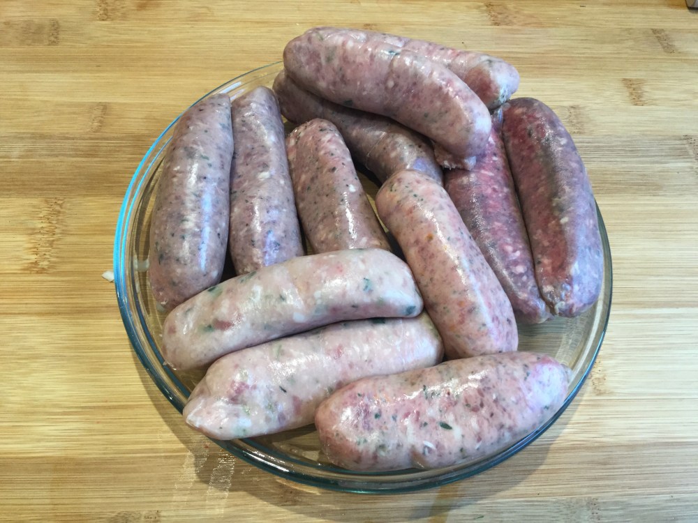 イギリスのソーセージは日本のと比べるとパリっという食感がなくて、より柔らかいのです。いろいろな種類があります。たとえば、写真にはフランスのトゥールズの味のや鹿肉のや豚肉とアンズのやスパイシーなソーセージを見えます。