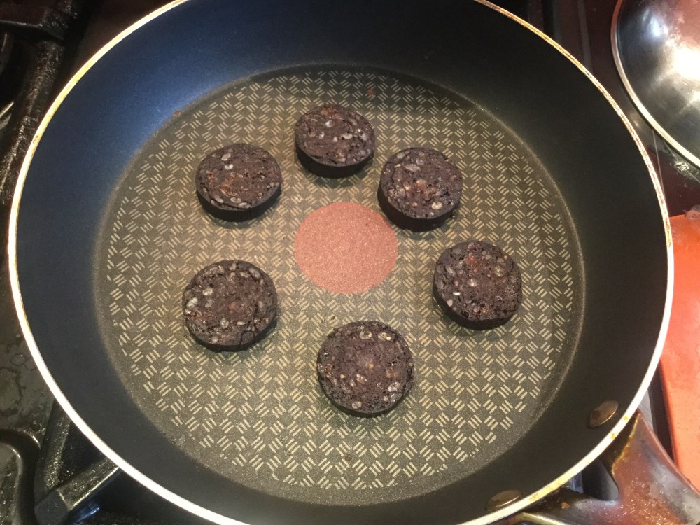 ブラックプディングとはイギリスのブラッドソーセージで、血液を材料として加えたソーセージです。それをスラスラしてフライパンで炒めます。(プディングとはデザートという意味ではなくて、プディングの起源から伝えた意味です。元々のプディングは全部ソーセージのように臓物に色々な具を詰めて茹でるか蒸した腸詰めの料理でした。)