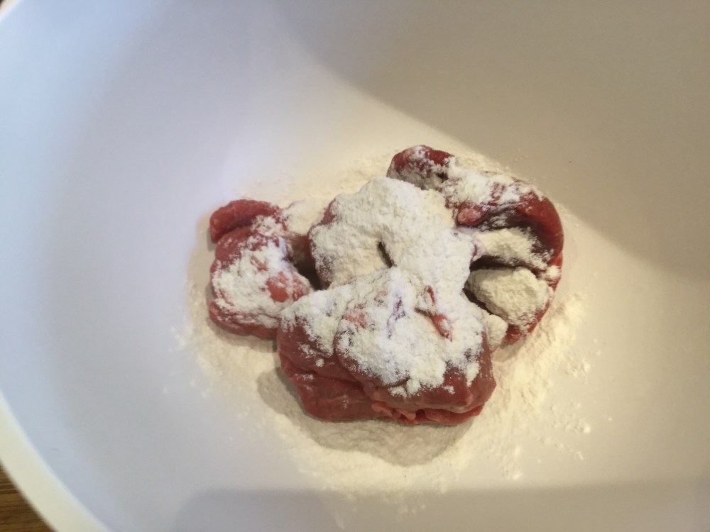 - ビーフと小麦粉をボールに入れ、混ぜる。