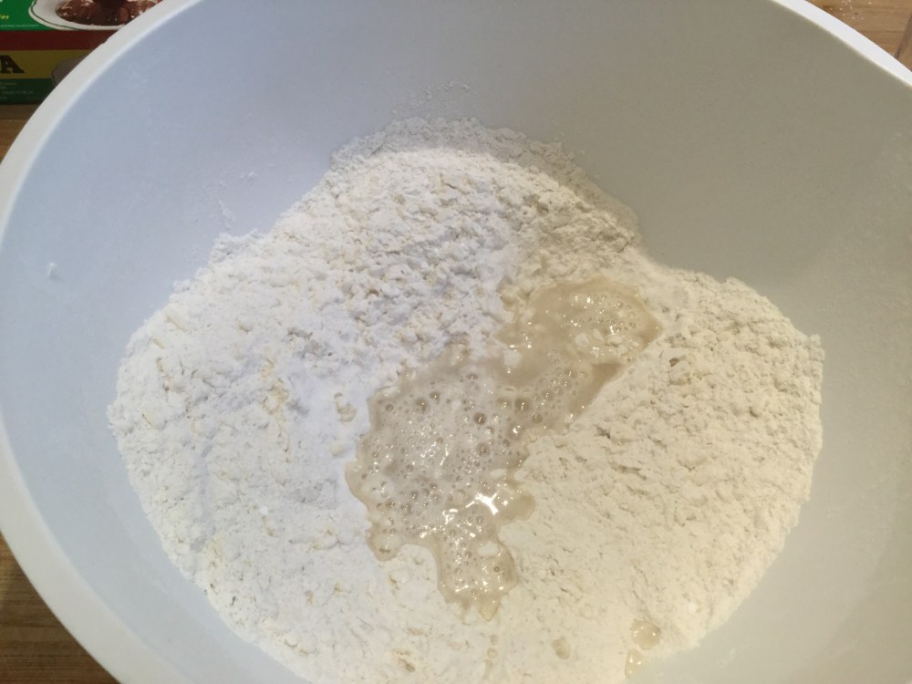 - 小麦粉、ふくらし粉、塩とスエットをボールに入れ、よく混ぜる。