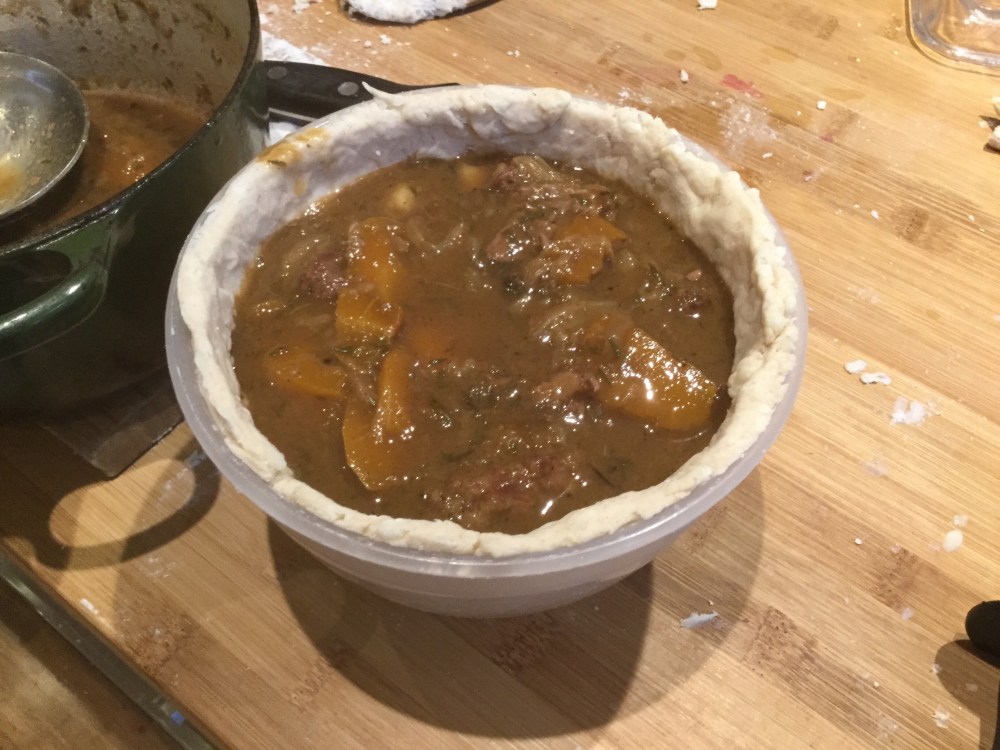 - ビーフと焼いた野菜を鍋に入れ、タイム、ビールとストックを加えて牛肉が柔らかくなるまで弱火に煮込む。「せめて2時間」