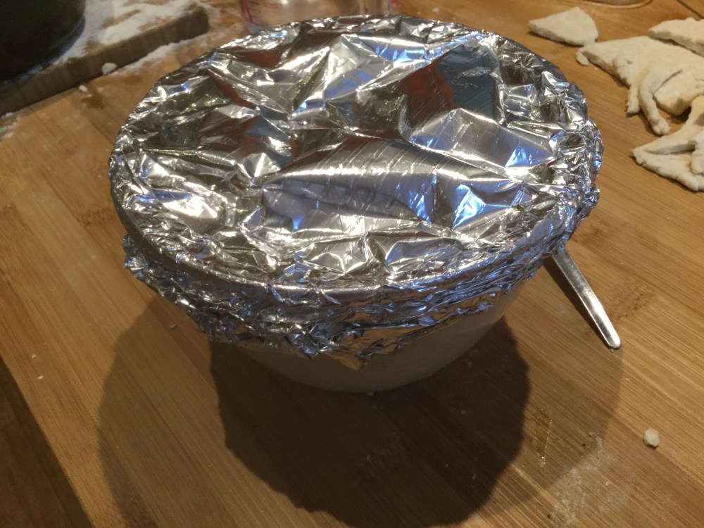 - プディング型の上にプラスチックかアルミフォイルを掛け、固定する。