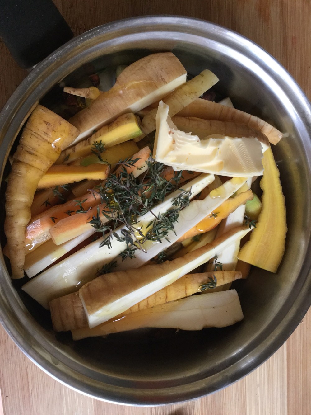 - ニンジンとパースニップを5mmから1cmほどの厚さに切る。