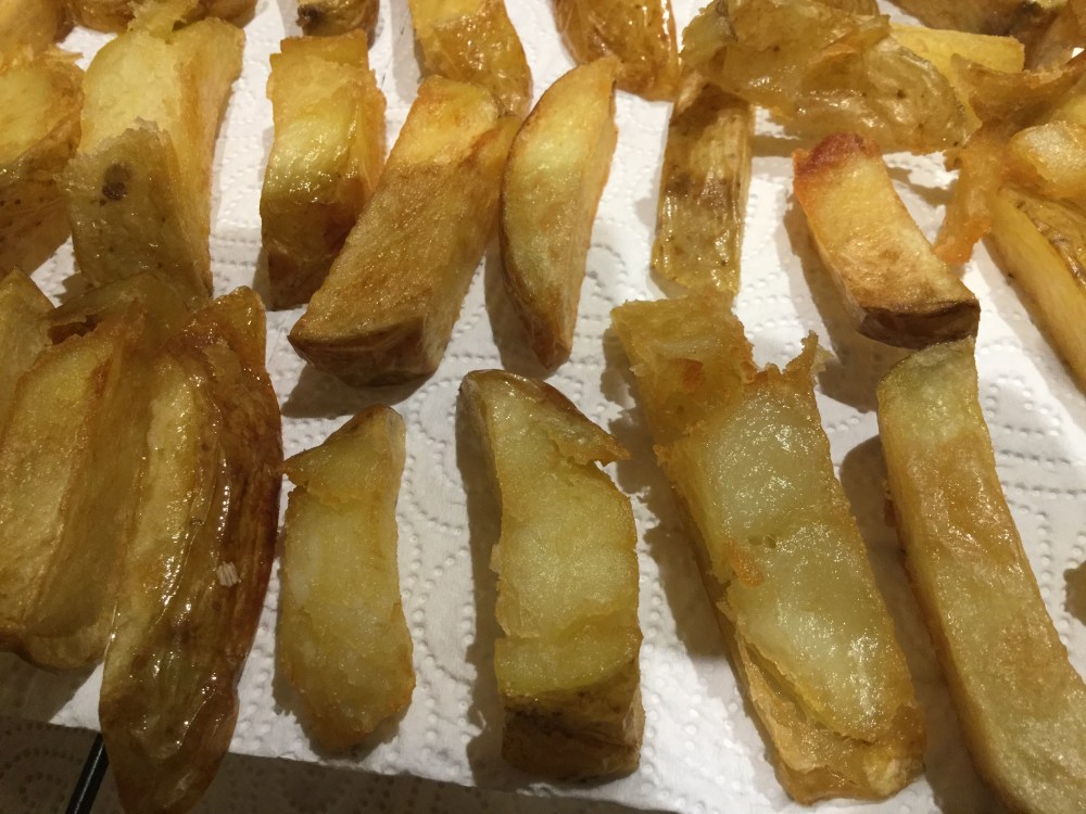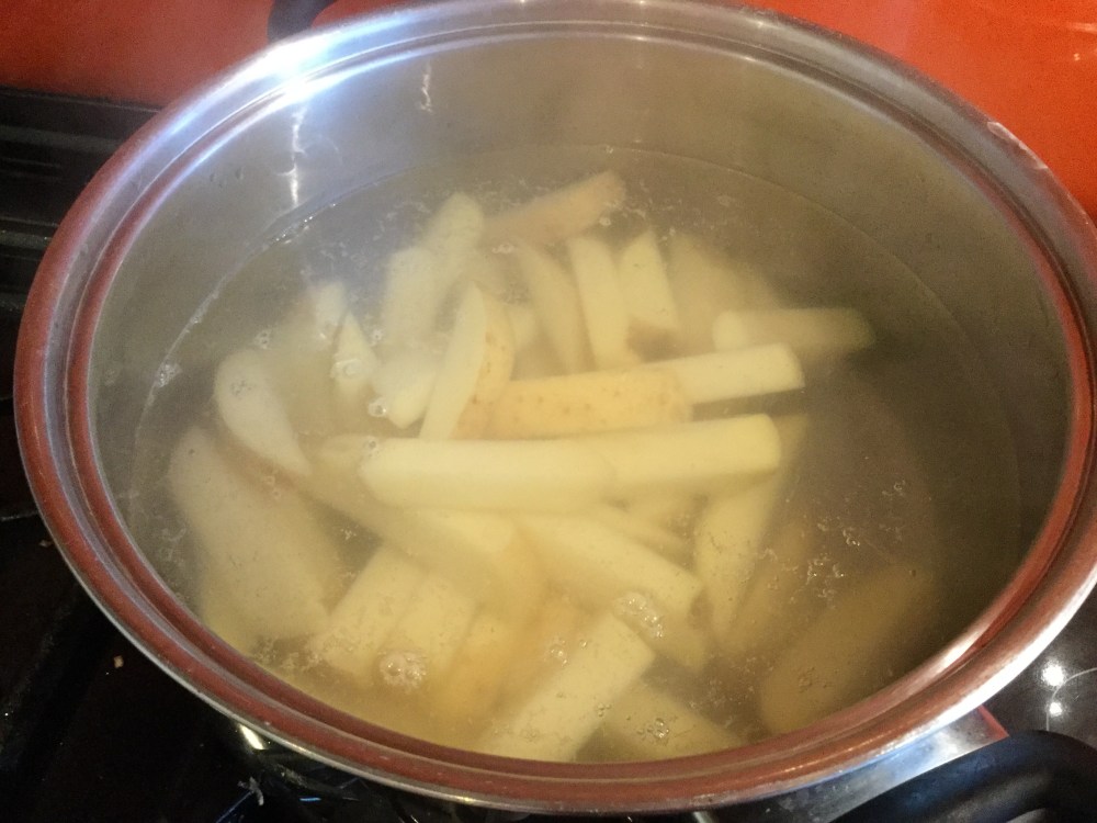 - 冷やしたジャガイモを130℃の油で約8ー10分で揚げる。(泡が立たなければ焼き上がり)