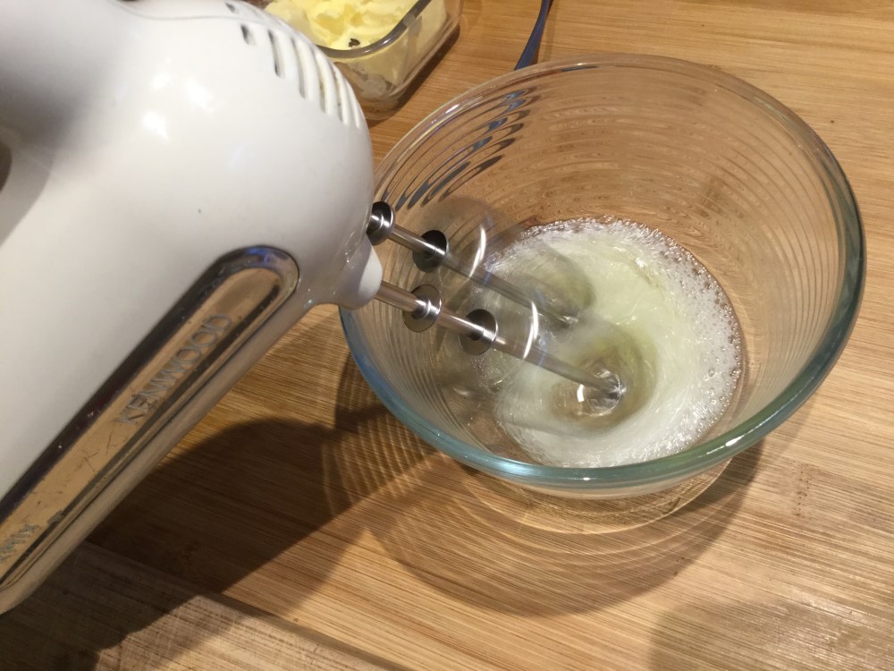 - 卵白はツノがピンとたつまで泡だて器で泡立てる。