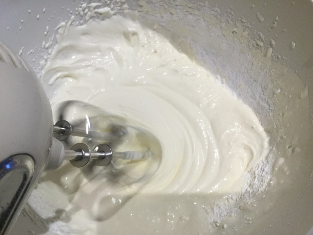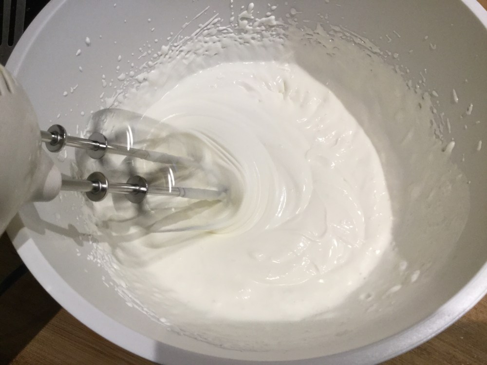 - ボールにクリームと粉砂糖を泡立て器でやわらかい角がたつまで泡立つ。