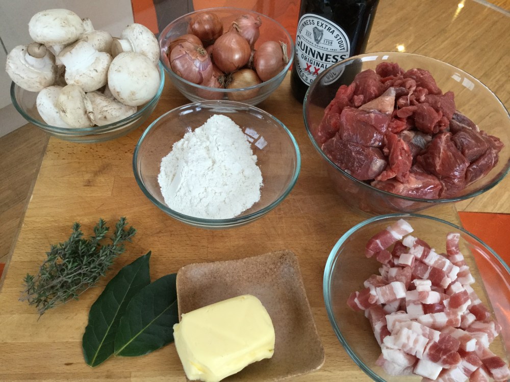 牛肉はネックとか肩とかすねがいいです。小さいタマネギなら、スライスしないで単に皮をむきます。小さいタマネギがなかったら、普通のをスライスします。キノコの種類は自由に。ベーコンをさいの目に切ります。
