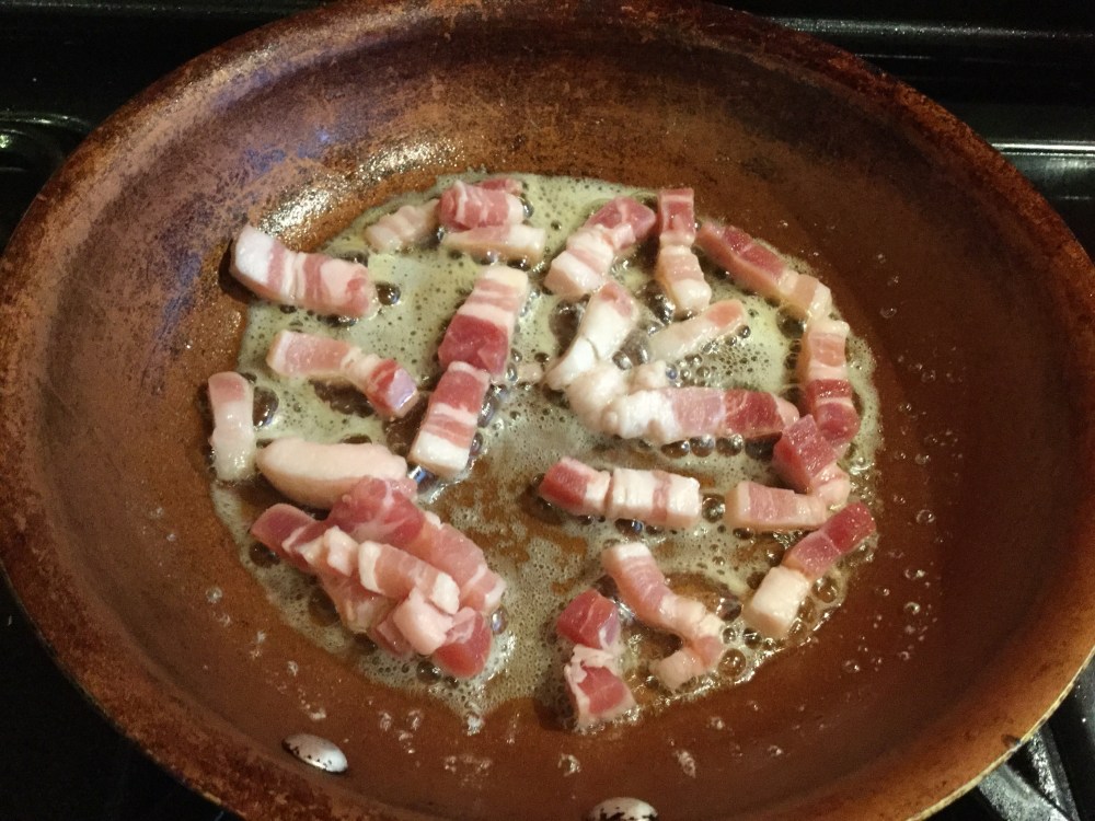 - フライパンにバターを溶け、ベーコンをこんがり焼く。これを煮込み用鍋にあける。