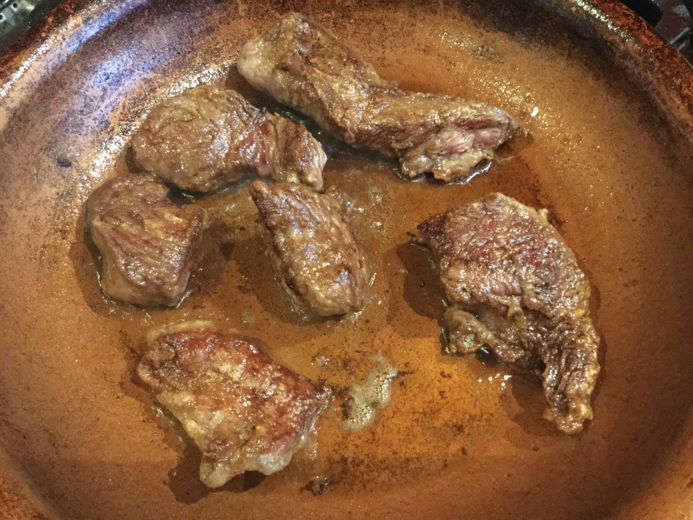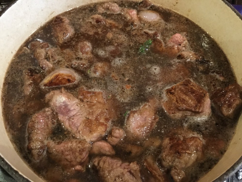 - 蓋をして中火に沸騰させる。三時間ほど120Cのオーブンで、または弱火で、トロトロ煮込む。(私は、オーブンの方が支配しやすい。)
