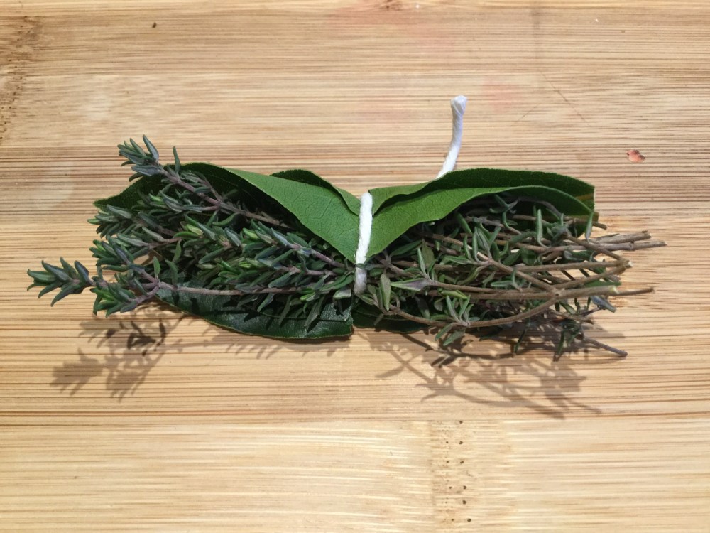 - 黒ビールとハーブを鍋に加える。(私はハーブをブーケガルニに作る。それで後に取り除きやすい。)ひとつまみの塩を入る。必要ならお肉までがすっぽり浸かるだけの十分な水を鍋に加える。