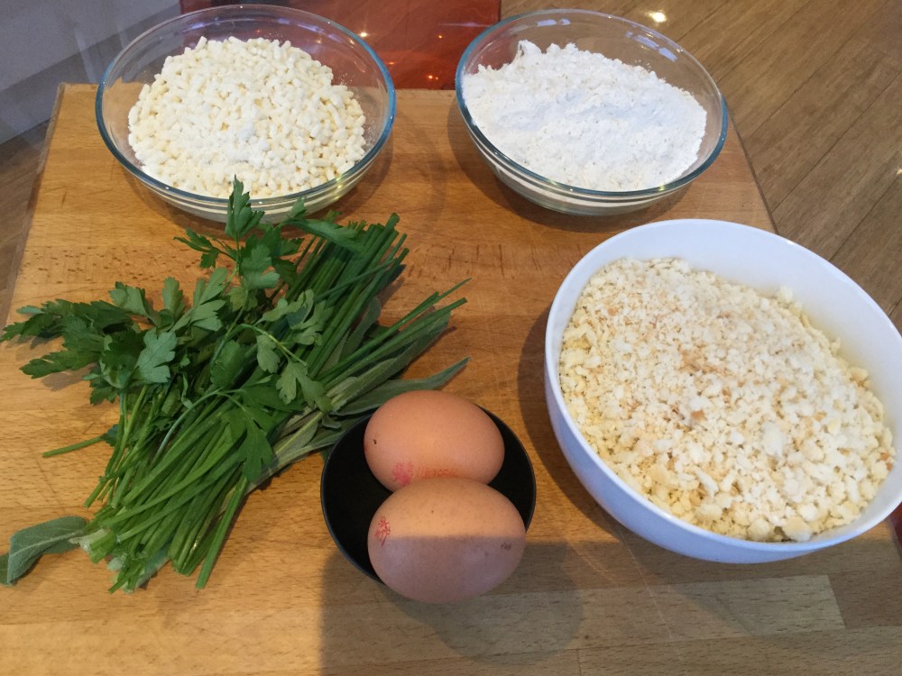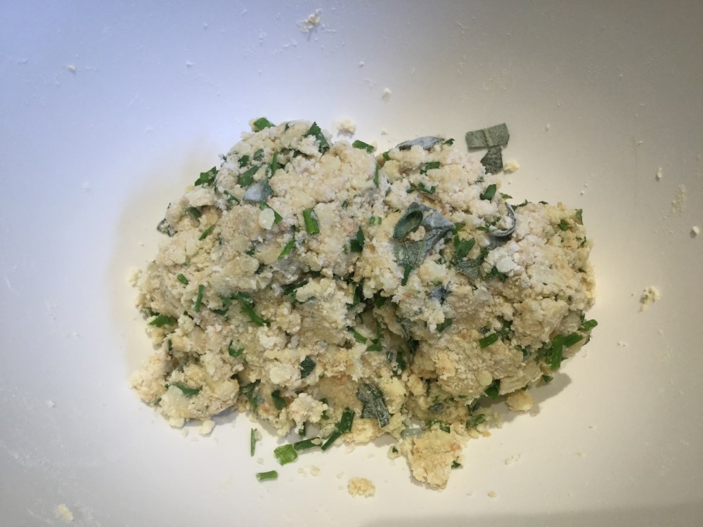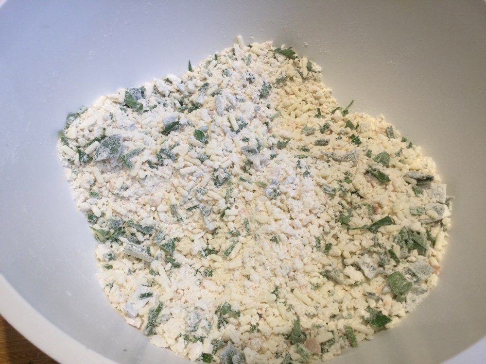 - 小麦粉、パン粉、ベーキングパウダー、スエット、ハーブと少しの塩をボールに入れ、よく混ぜる。