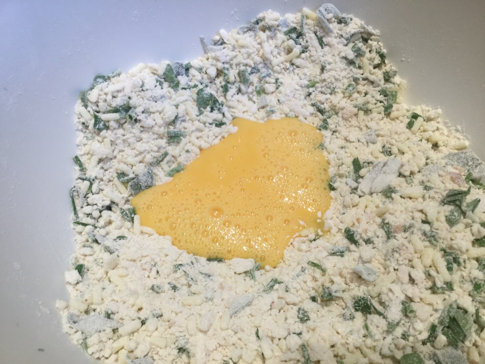 - 溶き卵を加え、材料を混ぜ、生地に全体をまとめる。