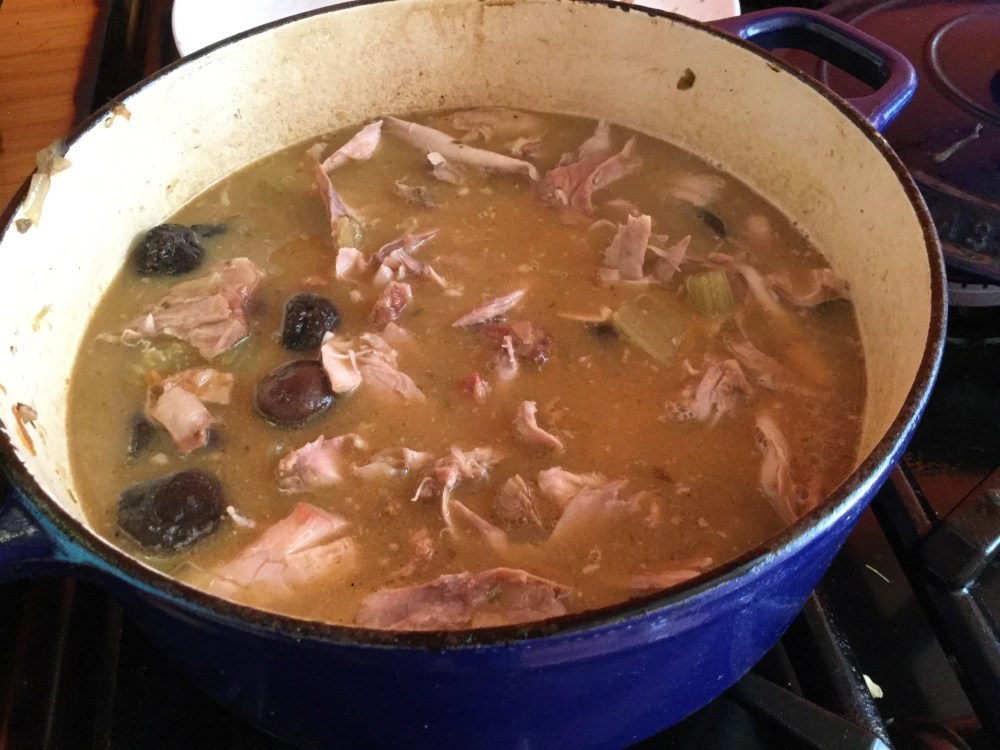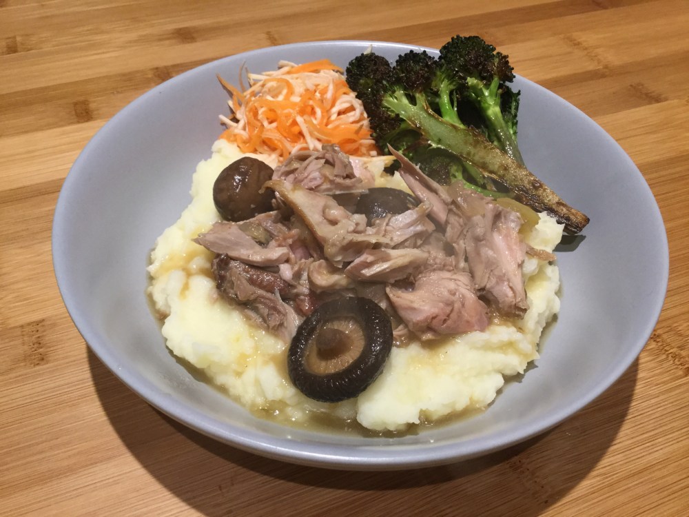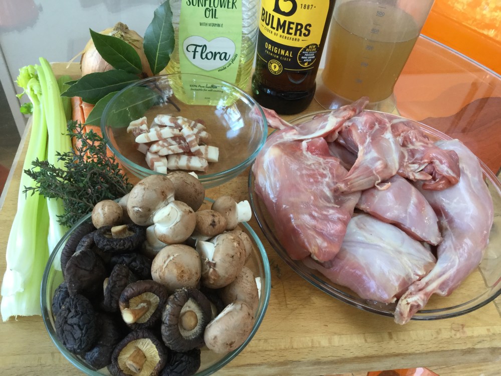 このレシピは野菜やハーブや液体を書いていますがこれは一応の目安で、セロリのかわりに玉ねぎやニンジンを増やすとか、そのように代用しても問題はありません。チキンストックがなかったら、水でも使えます。リンゴ酒の代わりに白ワインも用います。キノコはお好み種類。私は半分半分新鮮なマッシュルームと乾燥のを使いました。