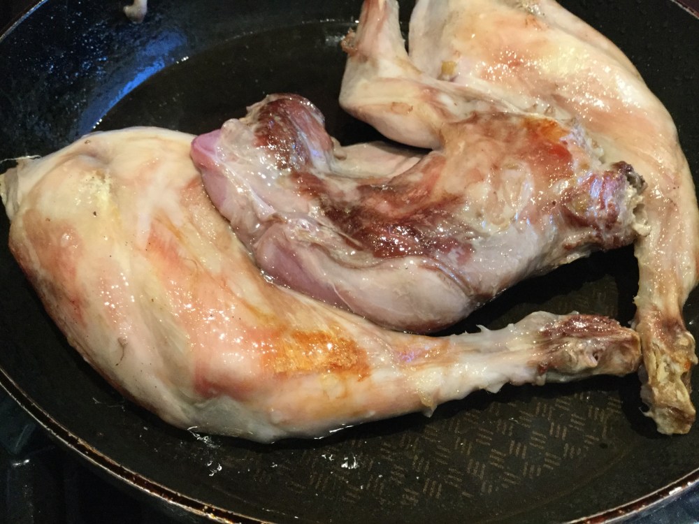 - 暖めたフライパンに強火でウサギが焼き色をつけまで焼く。
