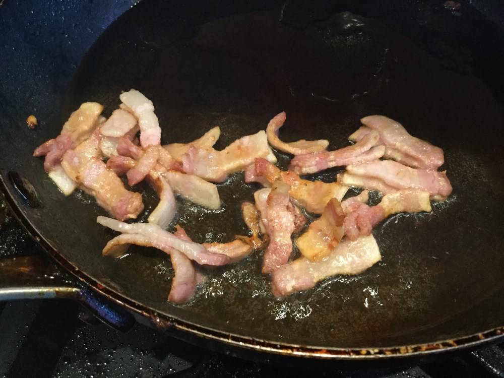 - フライパンにベーコンが焼き色をつけまで焼く。
