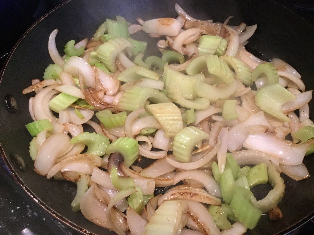 - フライパンにスライスしたタマネギとセロリが焼き色をつけまで焼く。