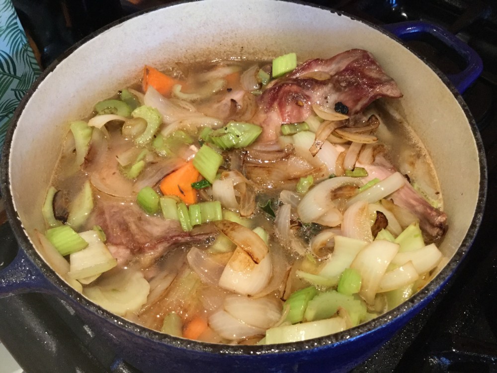 - ウサギの胴の部位以外、材料を鍋に入れて中火に沸騰させる。(これは胴の焼く時間が脚肉のより短いから)