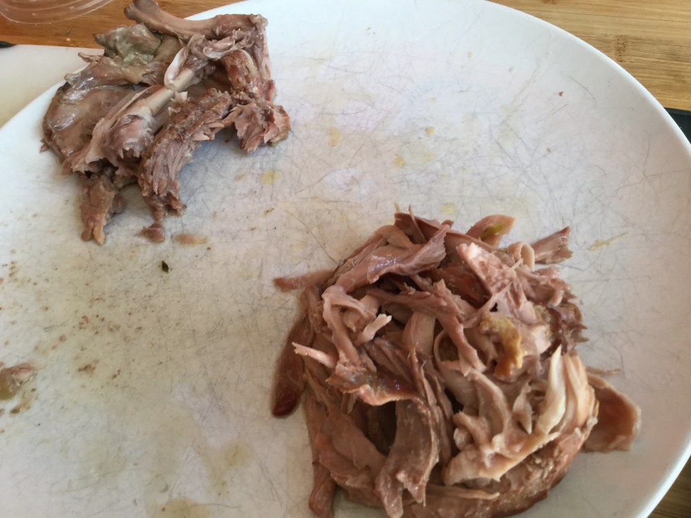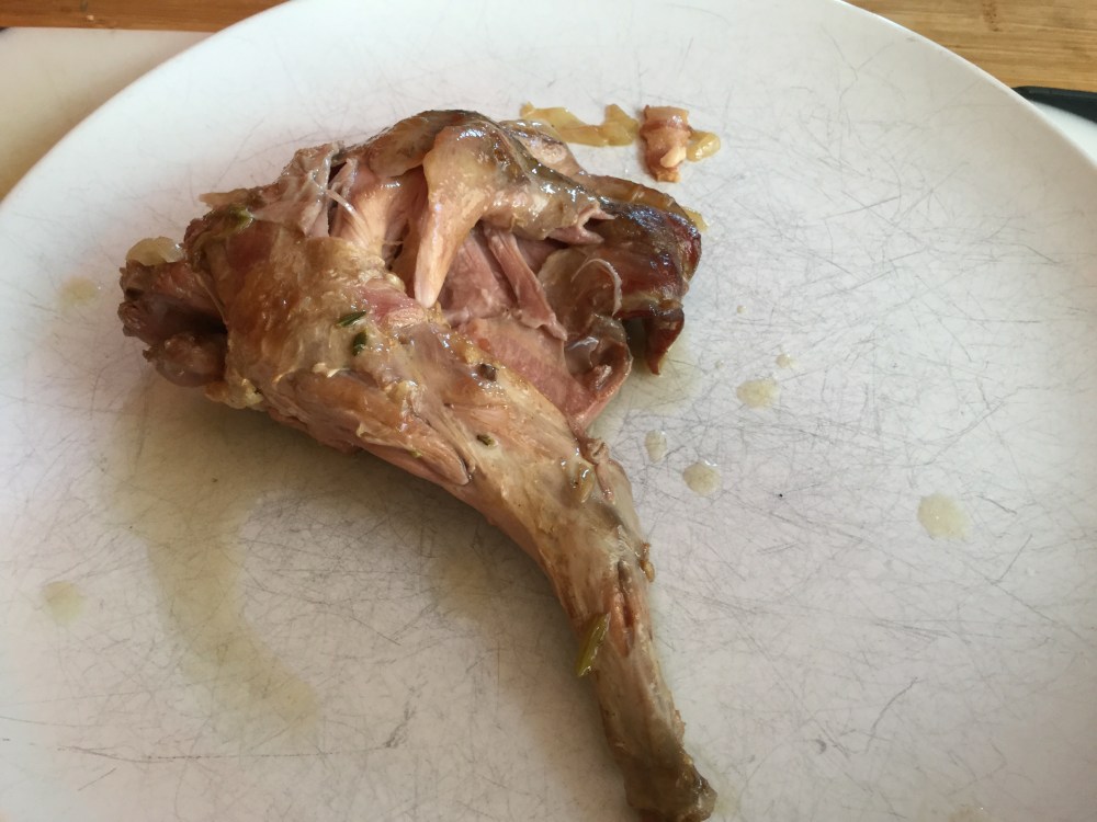 - ウサギは肉を骨から取る。骨とハーブを捨てる。