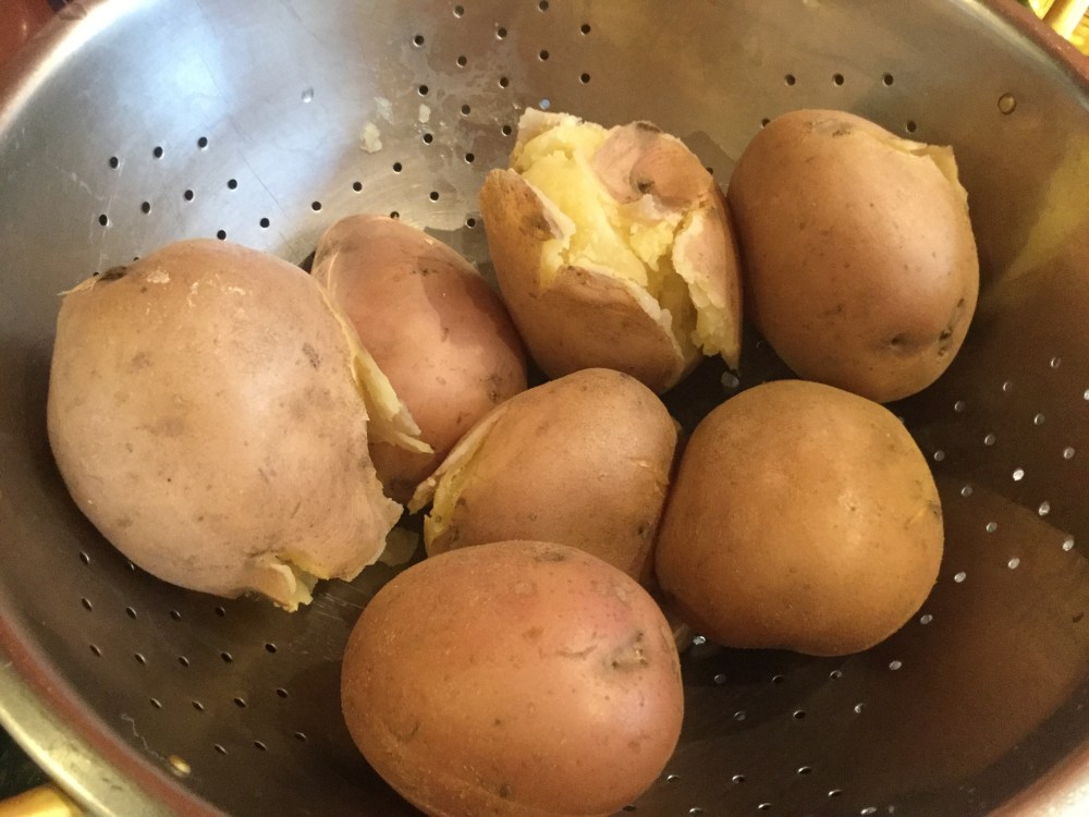 - 皮のむいていないジャガイモは塩の入れた湯に竹串がすっと通るまでゆでる。