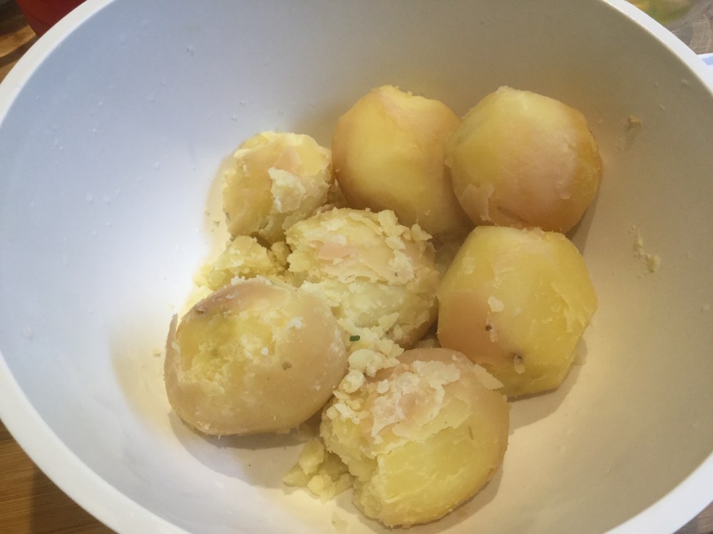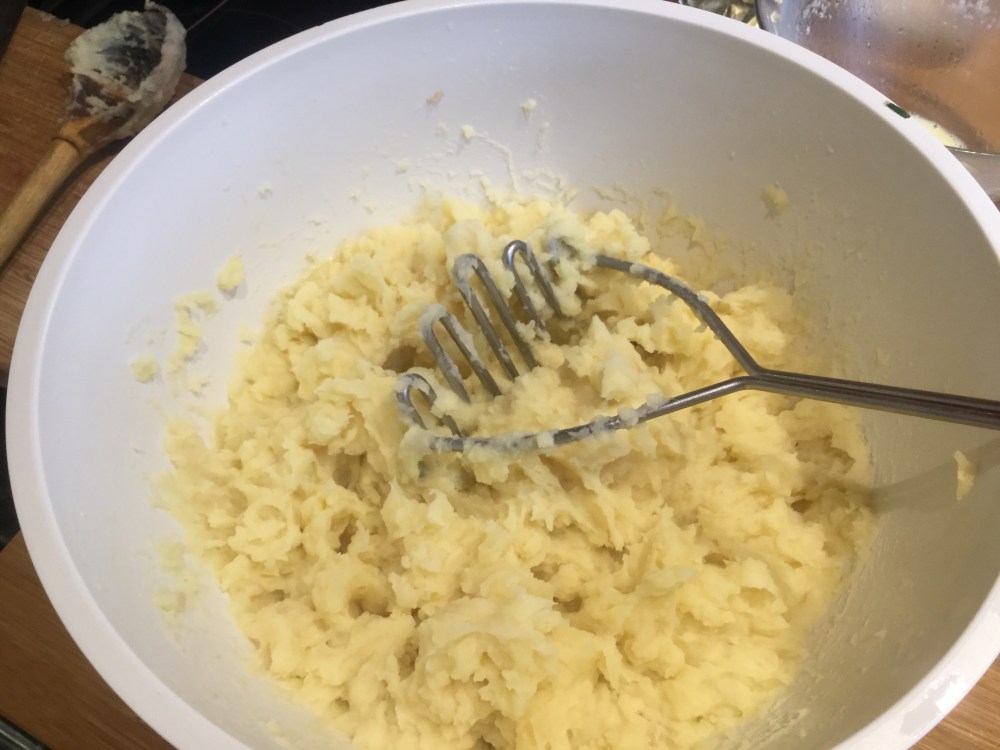 ブラックプディングとかローストハムのような水分の多くない料理なら、暖かい牛乳と溶けたバターをアップします。その場わいバターはジャガイモの重さの4分の1でもいいです。