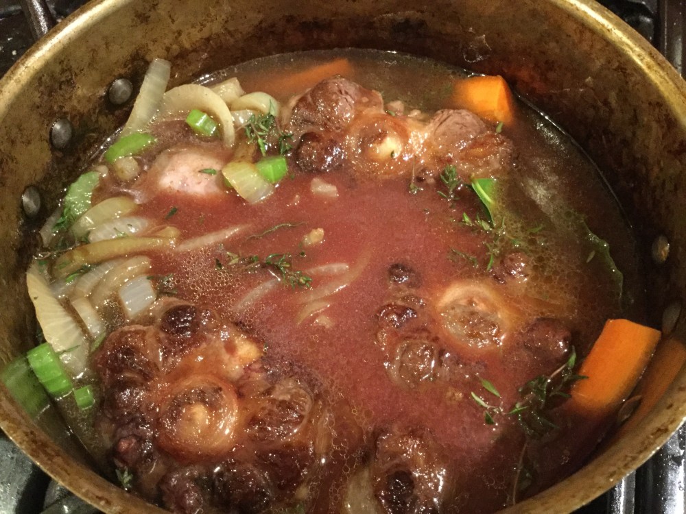 - 4時間後に混ぜる。必要なら少し水を加える。これからとびとびに出来上がるかチェックする。オックステールは柔らかく骨から撮りやすかったら出来上がり。