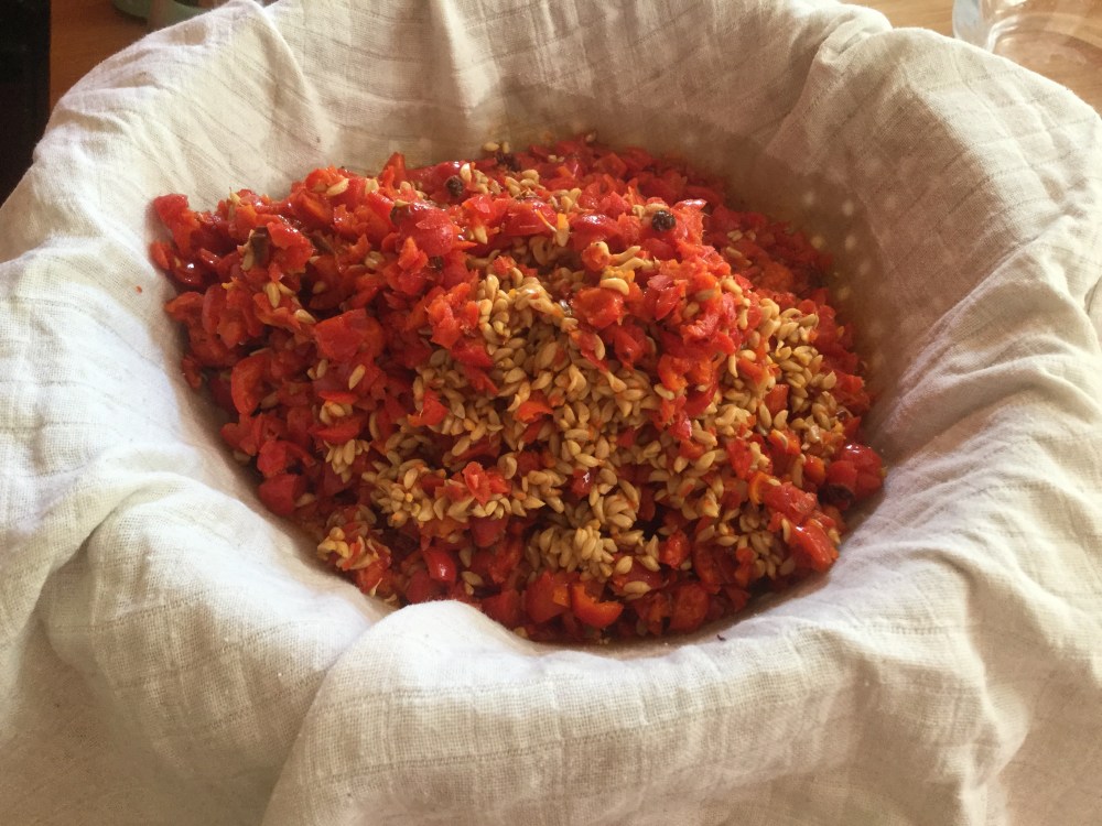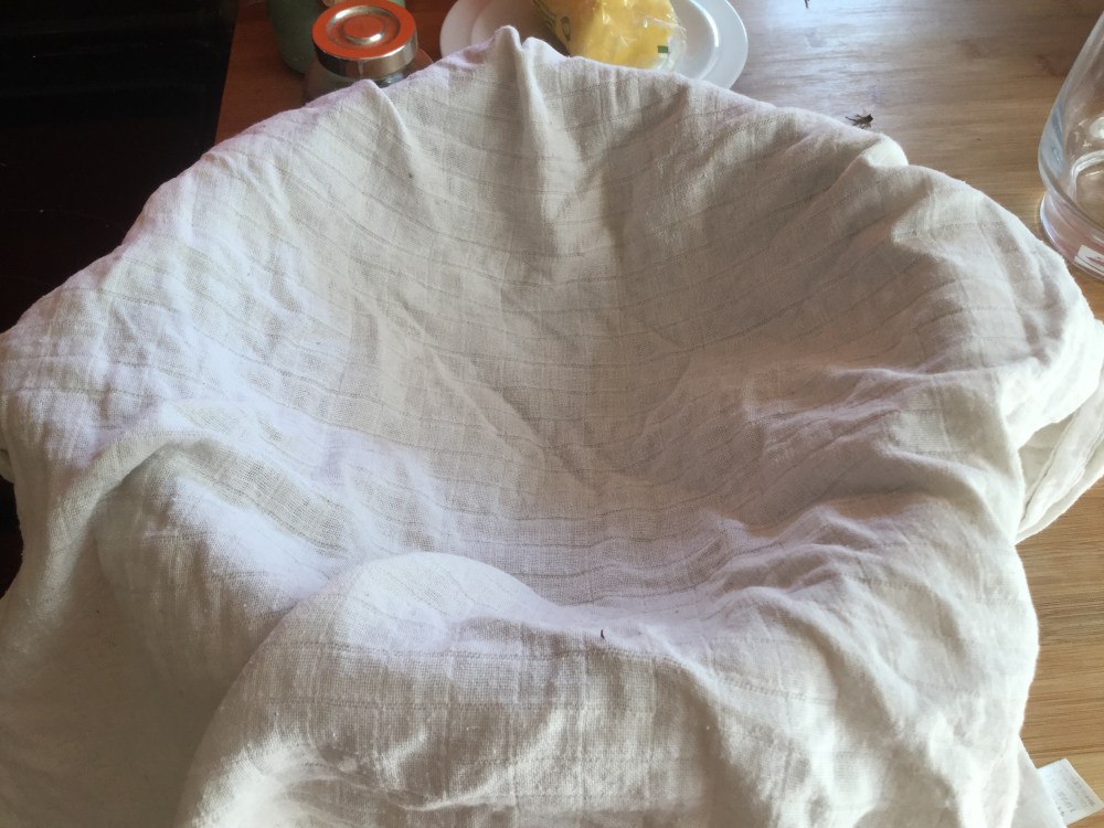 - 鍋の内容を料理の布でこす。