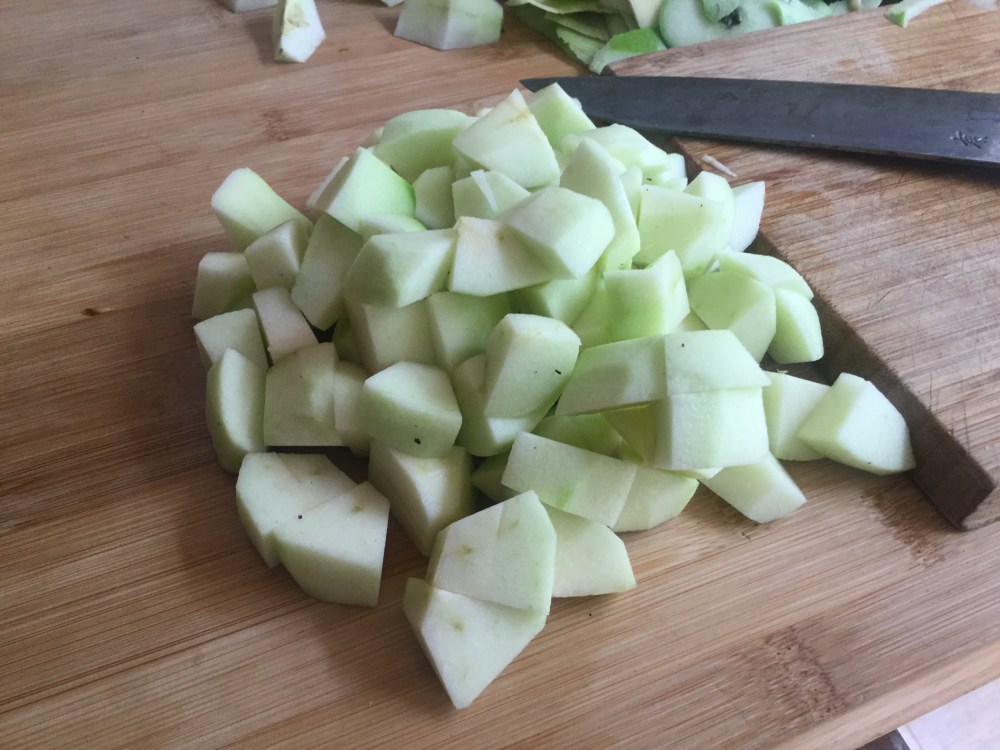 - リンゴは皮をむき、芯を取り除き、乱切りする。