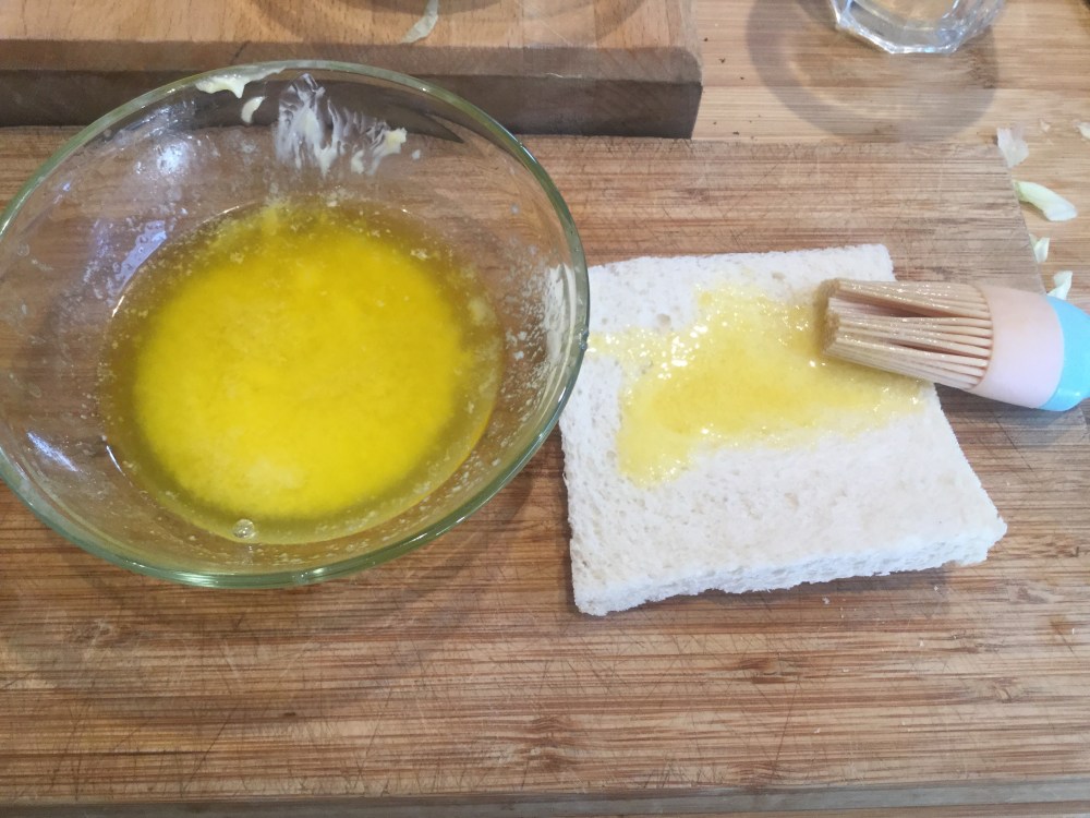 - パンの皮を取り除き、バターを溶け、パンの両側に溶かしバターを塗る。