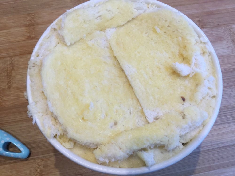 - プディングベースンにパンを敷き詰める。プディングベースンの高さに合わせてはみ出た部分をカットする。